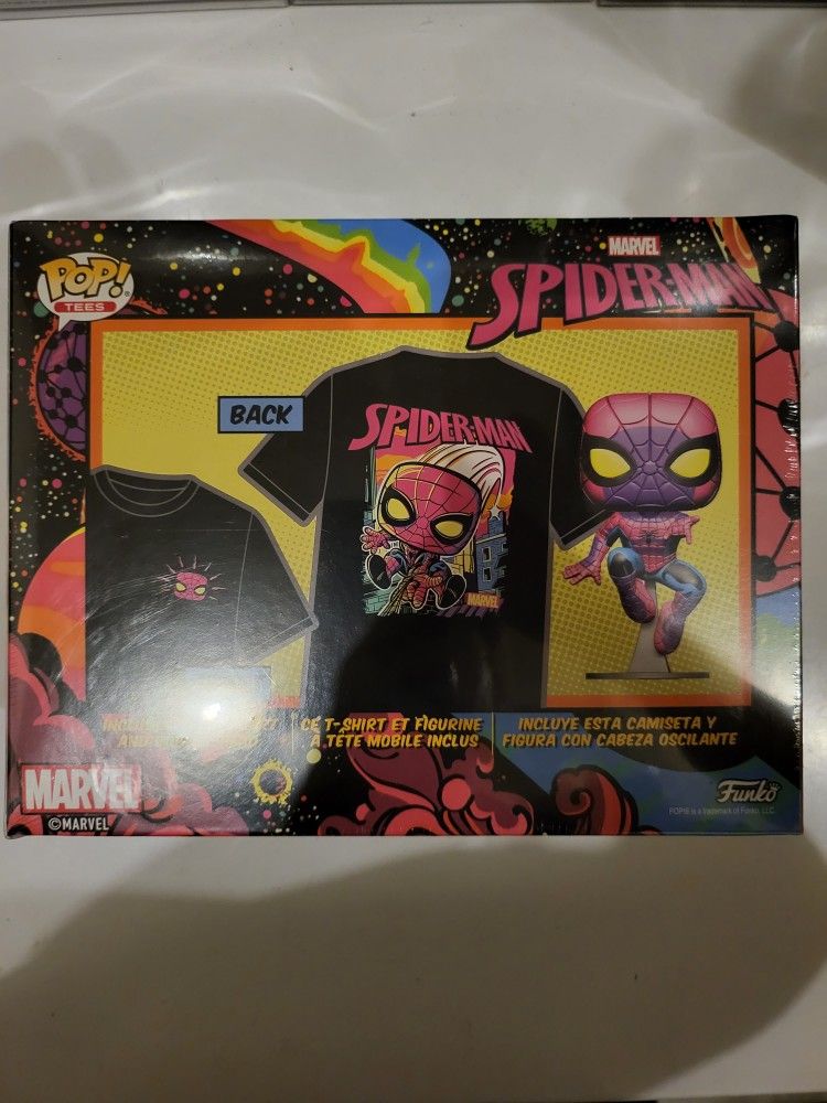 For sale is a Funko Spiderman (Black Light Edition) Pop & T-Shirt box Target Exclusive. Size large and sealed. Asking $125.
