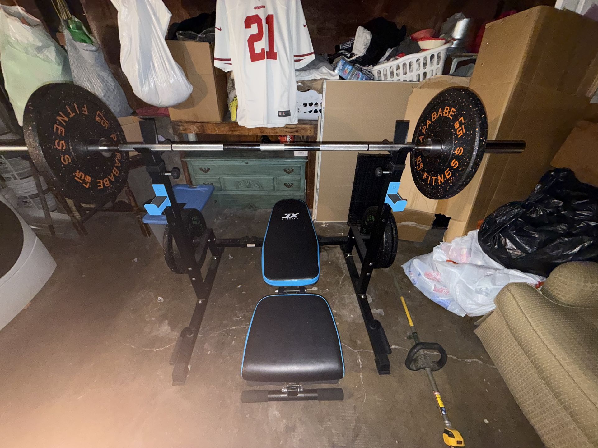 Bench press with bar bell and weights and a weight rack, brand new, used a few times. Everything is basically brand new.