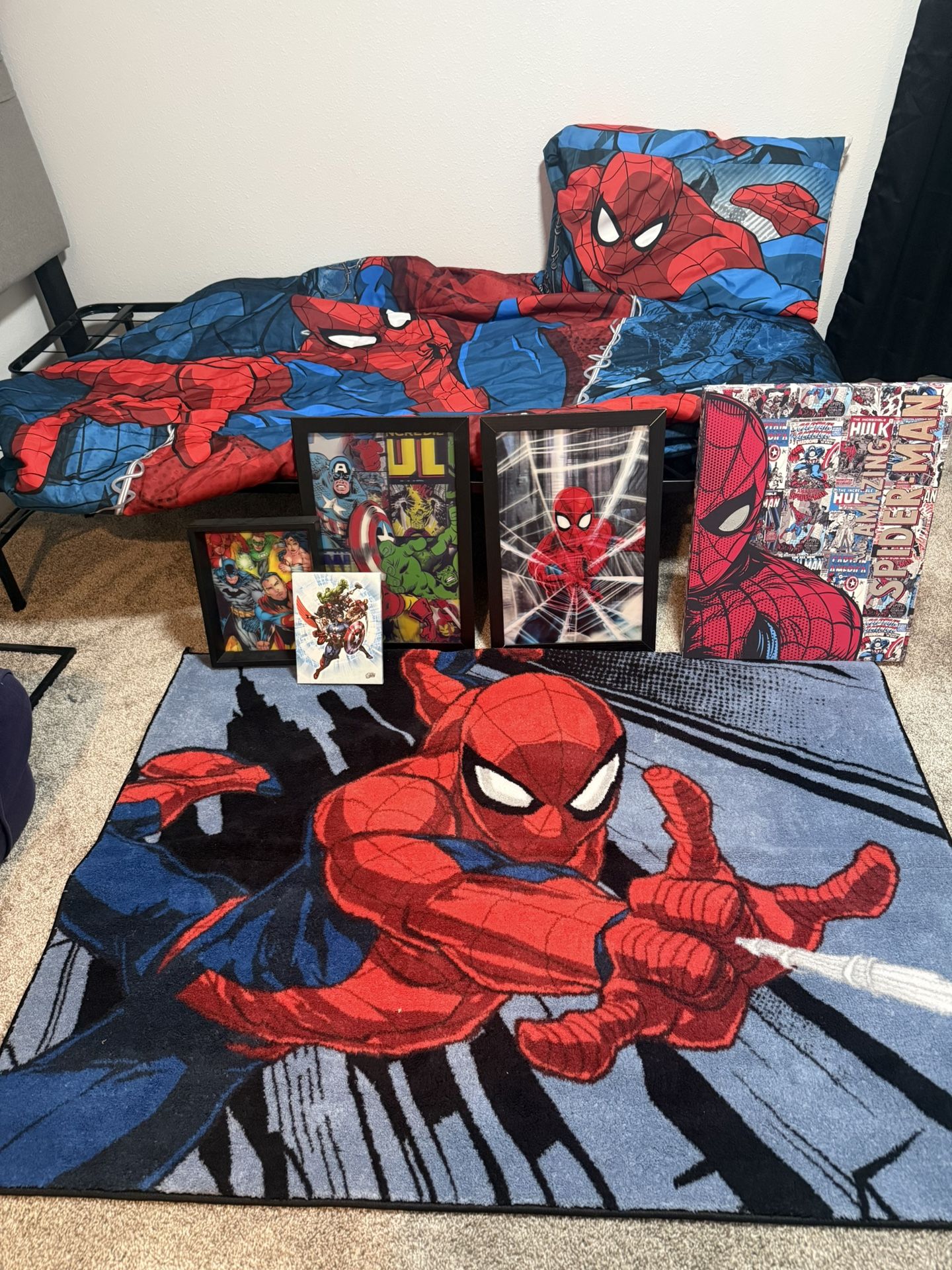 - Super Soft Reversible Bedding Includes fitted sheet, comforter, and pillowcase. - rug - Decorative frame featuring superhero and Spider-Man characters