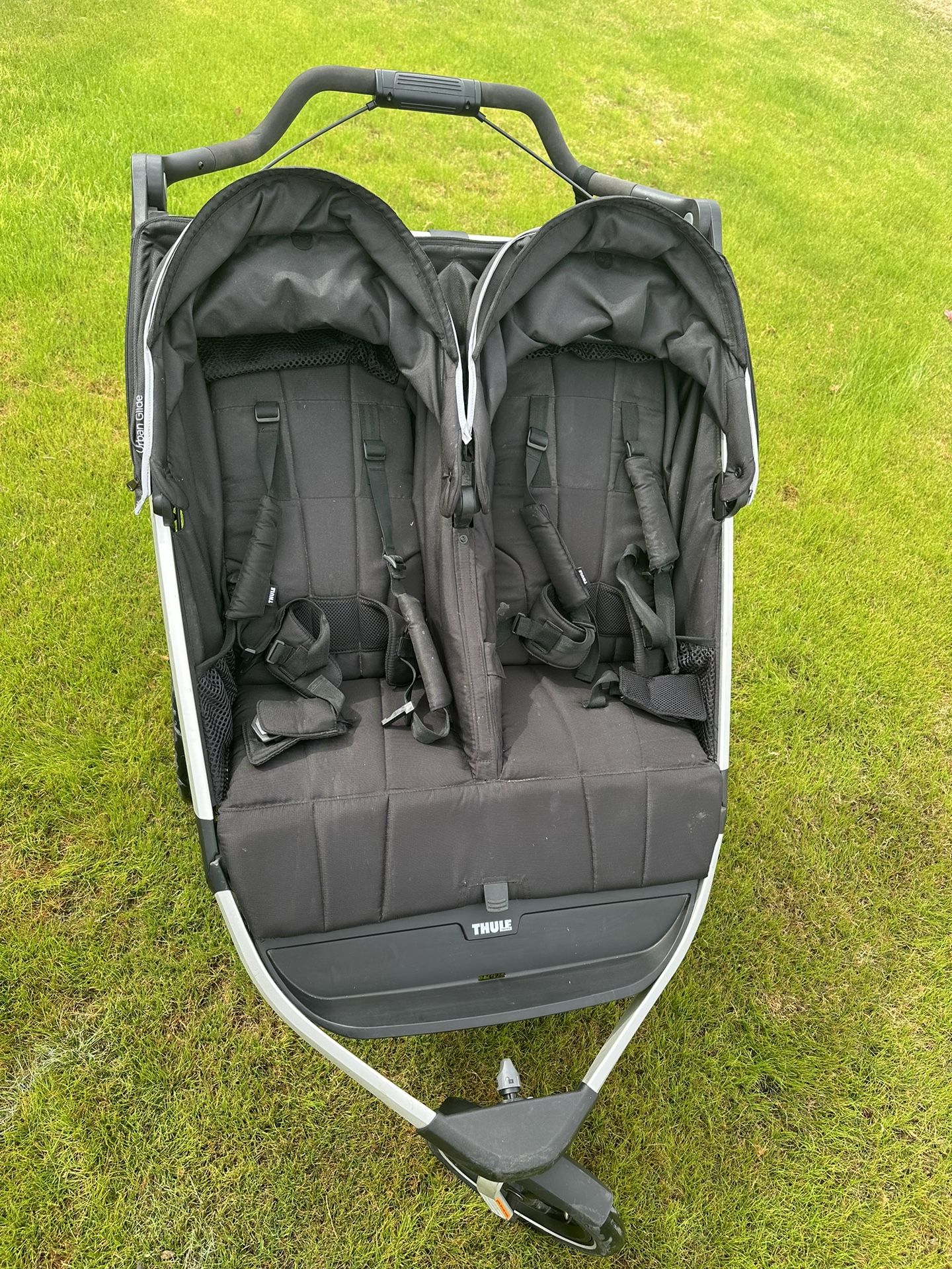 Used very minimal : In like New Condition Thule Urban Glide 2 Double Stroller Features & details An all-terrain double stroller perfect for jogging or strolling through town Swivel front wheel locks into place for jogging Large 16" rear wheels plus suspension for an ultra smooth ride One-handed, compact fold to easily store and transport Integrated twist hand brake provides speed control Reclining seats with padded 5-point harness and ventilation Ergonomic, adjustable handlebar with twist hand brake Large storage basket with zip top cover Weight capacity: 100 pounds Sitting height: 21 inches; Door pass through: 31.5 inches; Product weight 33lbs