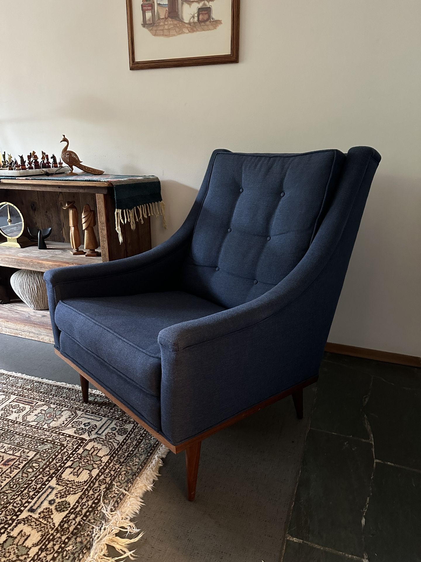 This classic mid-century armchair is exceptionally comfortable — the perfect everyday living room chair. The blue color easily matches any room we’ve put it in. The chair was professionally reupholstered a few years back (staying true to the original style) with new fabric, foam for the cushions, and batting for the chair. The covers for the pillows have zippers on them so you can remove and clean if needed. Normal wear and tear on legs. Would be easy to replace veneer/polish legs if removing small scuffs was important to you. Chair is from a clean, non-smoking home. As shown in the photos, we will include some extra fabric from when it was reupholstered. The perfect amount (approximately 32”x57”) for upholstering the top of a footstool or small ottoman to match. 27.5” wide at front (width tapers back slightly) 36” tall 25” deep at base / 33” deep with back included since the back leans slightly back Please feel free to message me if you have any questions! 😊