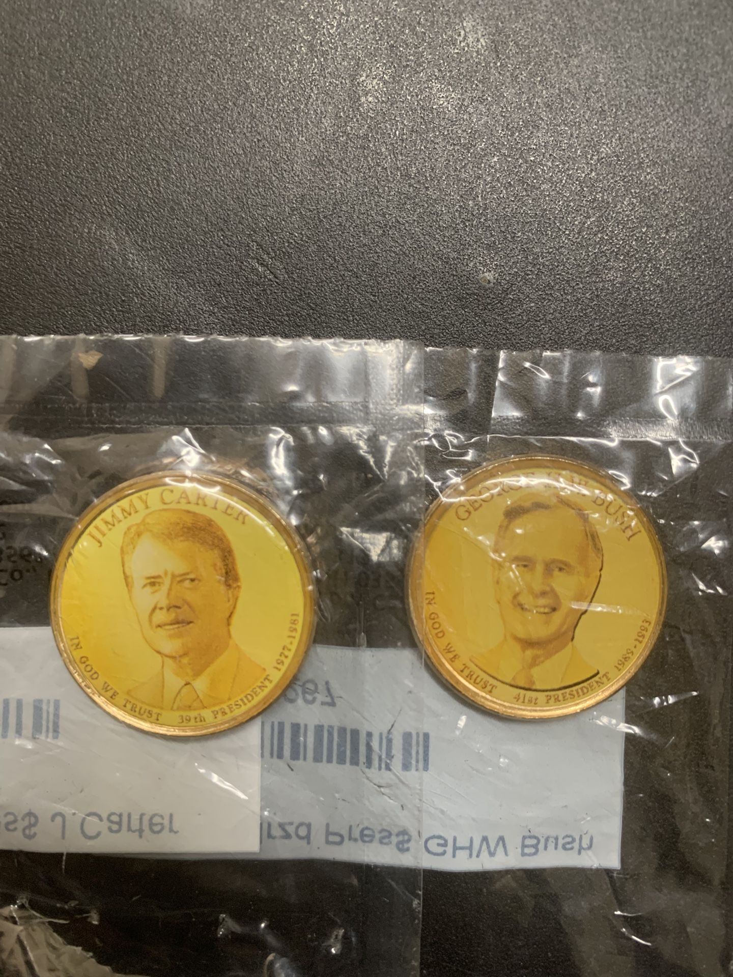 These are two $1 gold color coins with a picture of the two presidents J. Carter and G. W. Bush. They are in their original packaging. Coins are not graded but are in BU (brilliant uncirculated) condition. You will also get a 2025 P & D penny in AU (about uncirculated) condition. I prefer local pick up. I am willing to meet half way as long as it’s around/inside Loop 610 perimeter. If mailing is required, I will process mailing within 5 days @ $5.49. If price is more, I’ll cover the difference. Many thanks for visiting. Online pics. of items are only for comparison use.