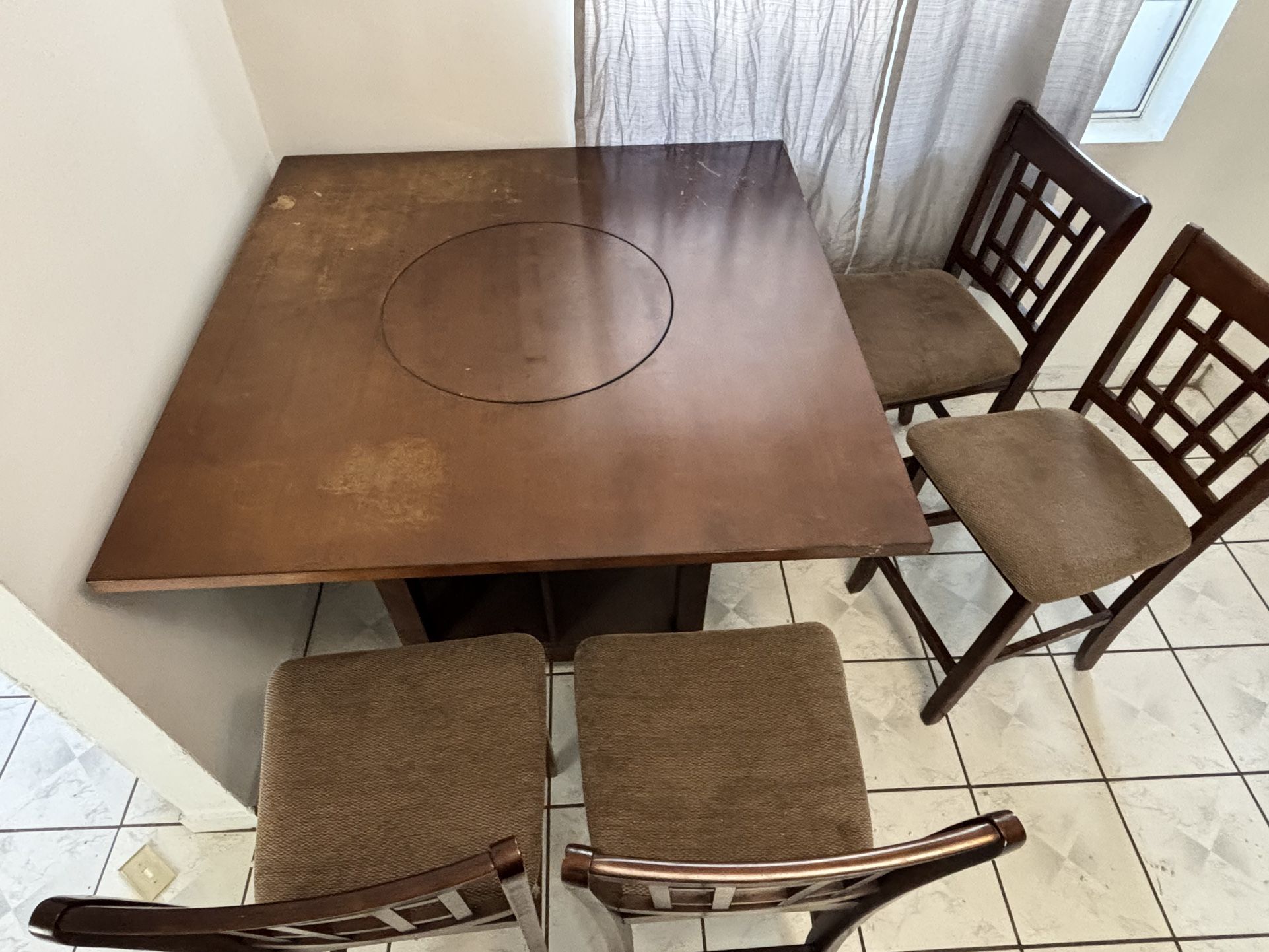 4x4 foot table top, 3 feet high, with compartments for wine bottles, manual spinning center top, and 4 dining chairs