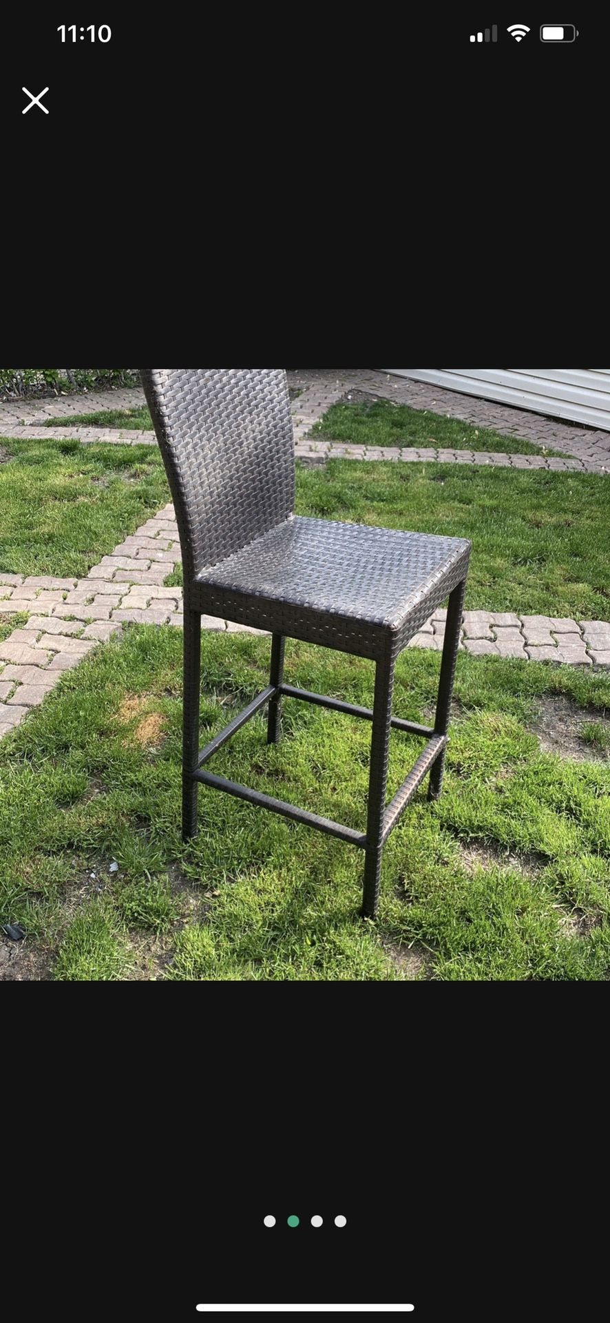 Set of three, dark brown, counter height barstools. Style is coastal, with a woven vinyl seat and seat back. Sturdy. Not wobbly. Barely used