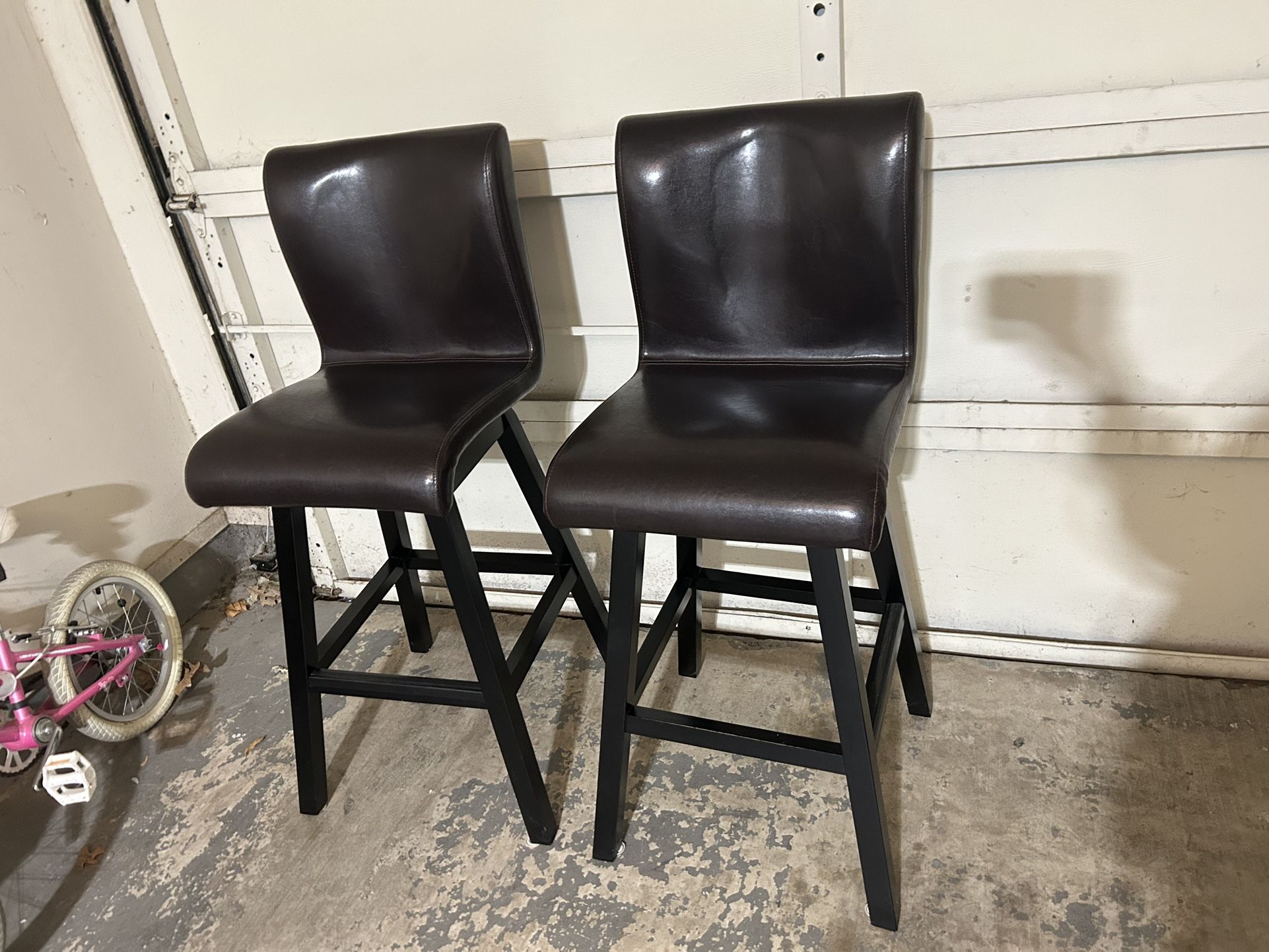 Set of 2 counter-height swivel bar stools (32” tall x 17.5” wide). Black legs, dark espresso/black seat. Clean, sturdy, swivels smoothly. Very good quality. Like new.