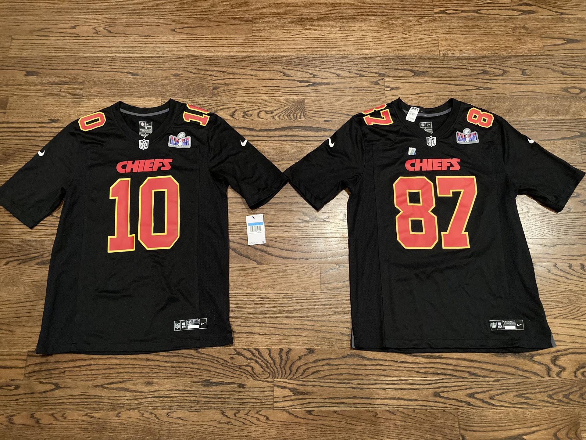 BNWT Chiefs Kelce and Pacheco Super Bowl LVIII Black Nike Game Jerseys FOR SALE! **MAKE CASH OFFER ON 1 OR BOTH-OPEN ON PRICE** RETAIL $150 each. BOTH BRAND NEW AND AUTHENTIC WITH ORIGINAL TAGS ATTACHED! Kelce size Large and Pacheco size Medium. Black/Carbon with KC Chiefs Red and Gold Lettering. Official NFL and Commemorative Super Bowl LVIII patches attached. Collectible! Local pick up around Chicagoland preferred.