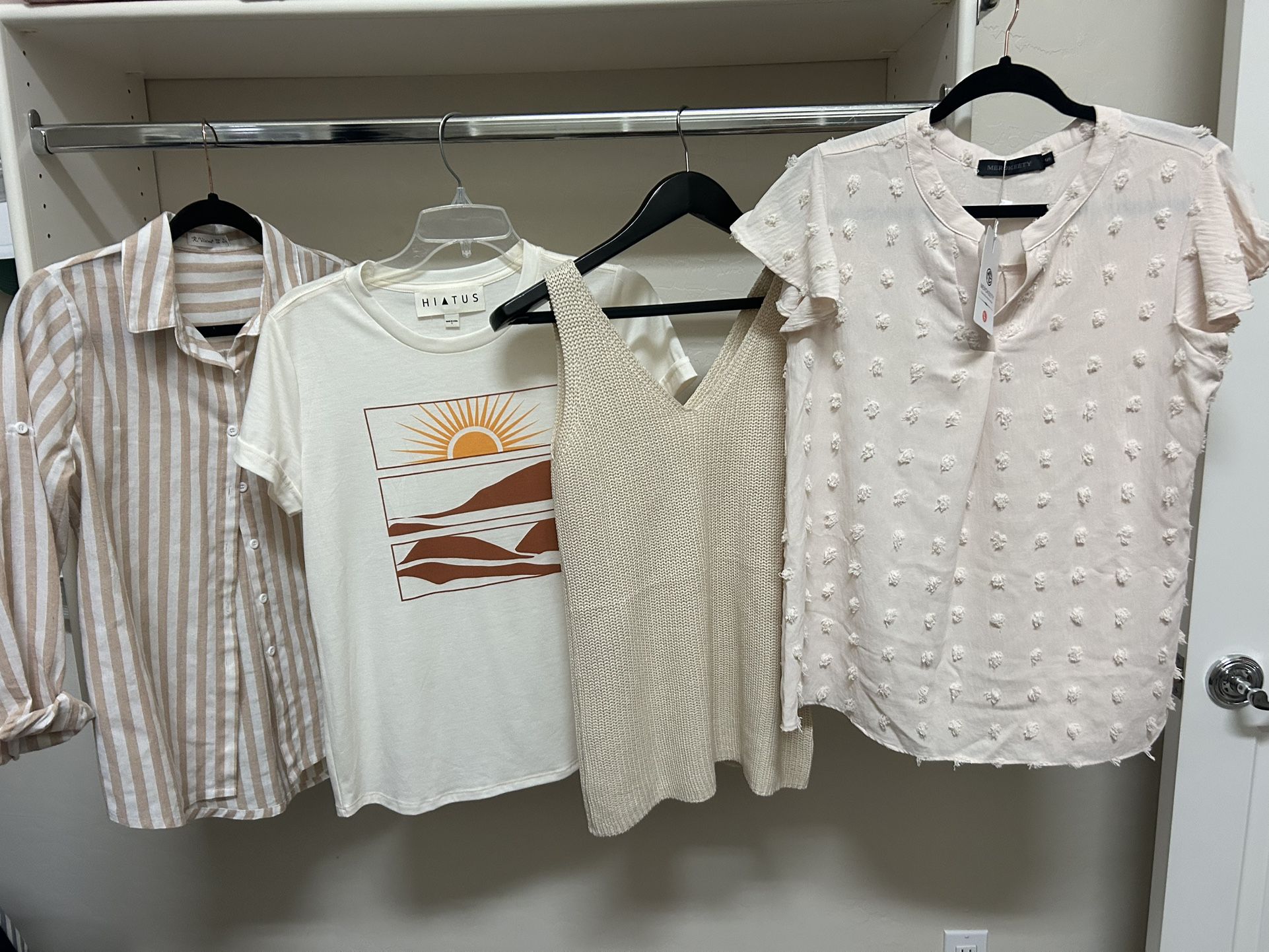 1) Stripe button down - R. Vivimos. Size 4/6 2) sun - Hiatus. Size Sm 3) sweater tank - 8xyhot. Small 4) V neck Blouse - Merokeety. Small. NWT Pick up ~ Val vista & McKellips