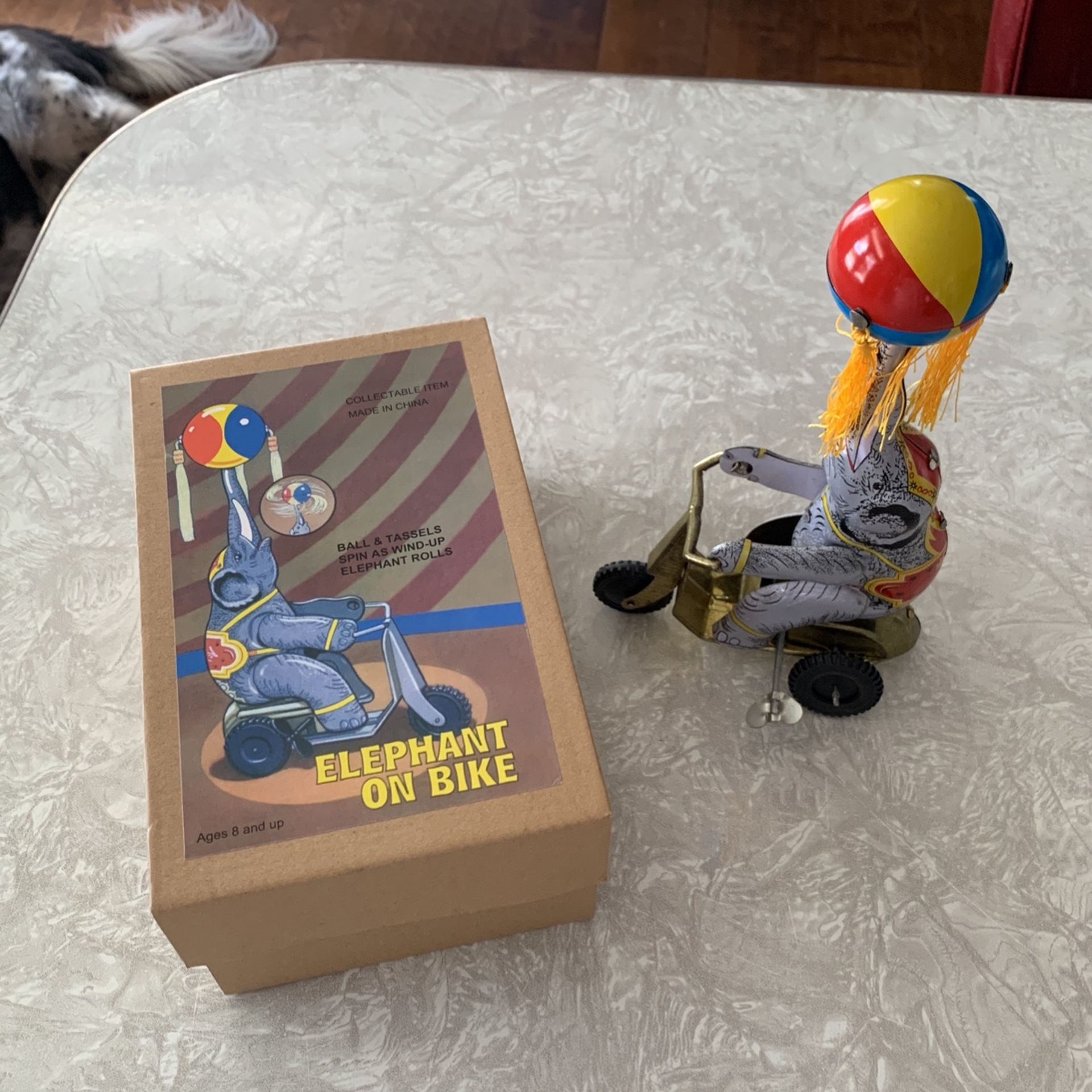 Sweet metal elephant on bike carnival toy Vintage style New in box Works Fun decoration or to play with Bundle discounts available please check out all our other listings if it’s listed it’s available thank you