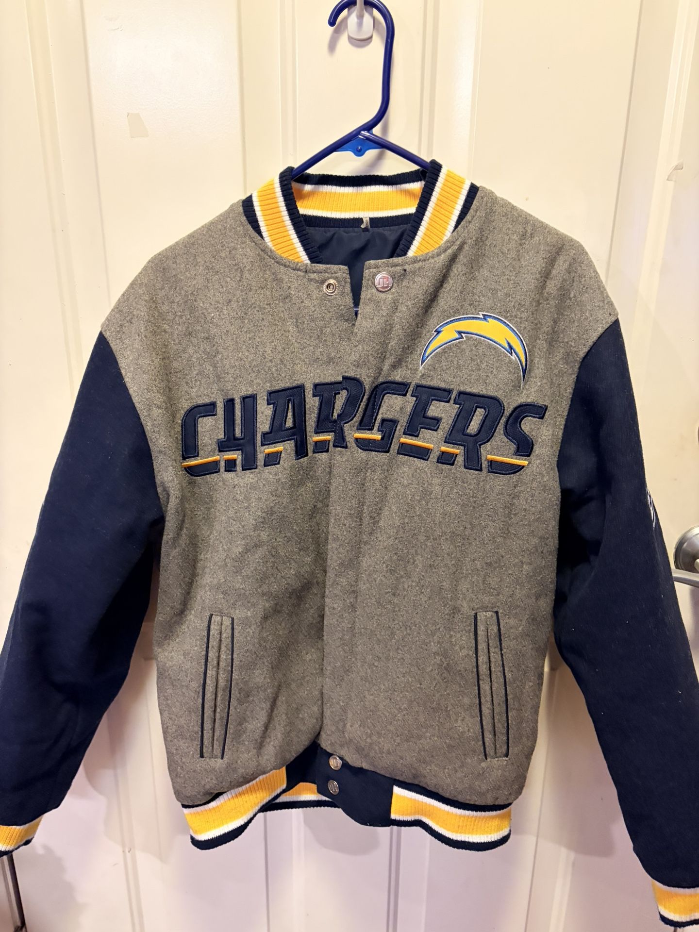 Stylish Chargers reversible varsity jacket with bold logo. Features gray body and navy sleeves. Accented with yellow details.
