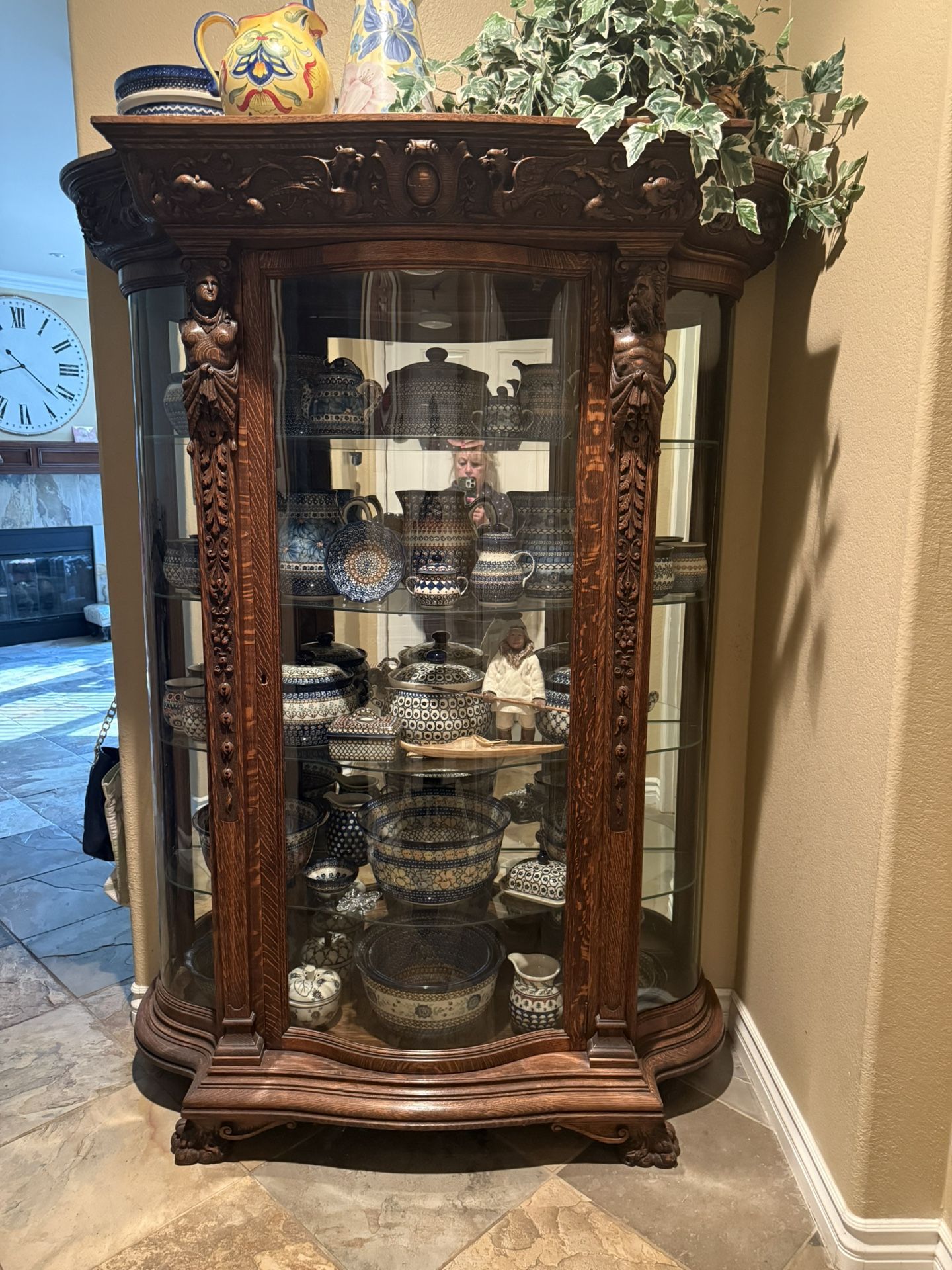 Beautiful China cabinet has lots of carving well taken care of. Items inside, not for sale.