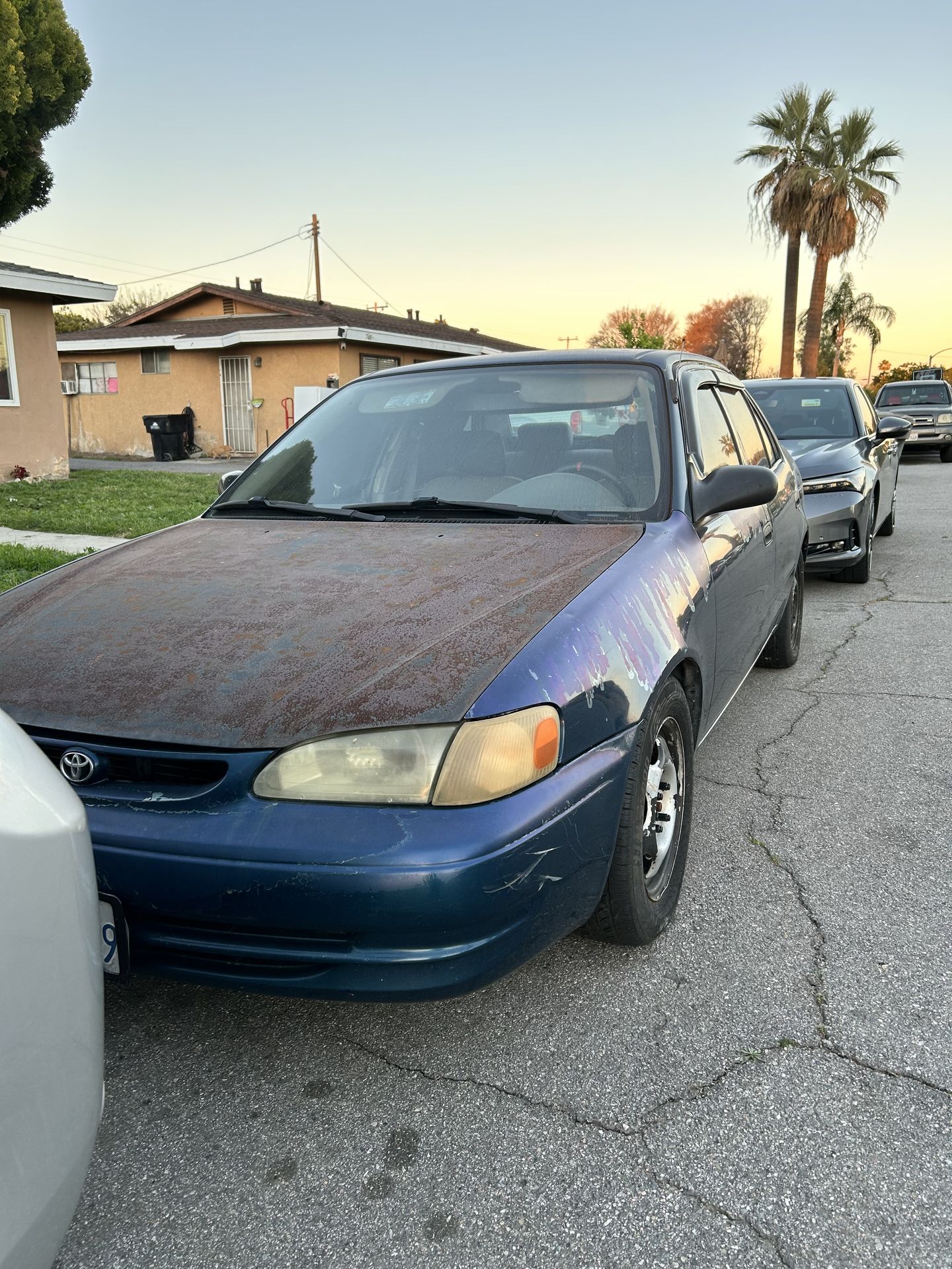 98 corolla 6peed manual transmission Was my daily for the past 5 years Last known mileage 187334 but dash stopped working so now roughly 190000 Car is old and ugly but runs and drives like it should Has slotted rotors with cheap coilovers stock wheels are back on but missing one idk what happened to it Quick release steering wheel Radio Ac Heater All seats are in tacked no rips just dirty from spillage Interior 1/10 Exterior 1/10 Clutch and rack in pinion where done at the same time but power steering pump still leaks No tail light or headlight they stopped working so I installed off road pod lights to make it to work in the dark No muffler so the rear passenger tire gets dirty Engine burns oil $600 takes it best deal for a running car Tags are due March 10th 2026