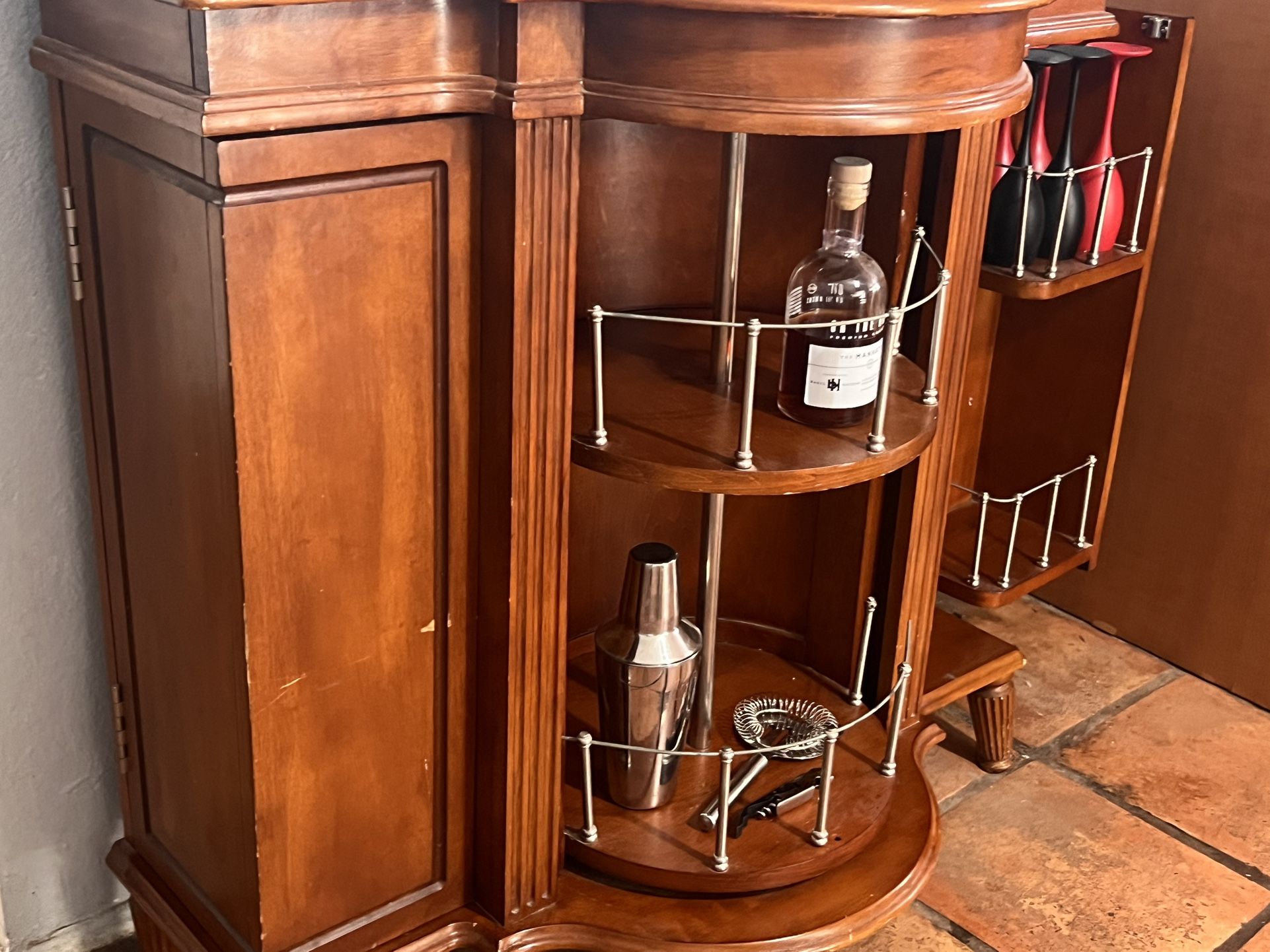 Solid wood heavy . Had wood legs that need to be tighten but i dont have the strength to do myself . Otherwise in great condition.