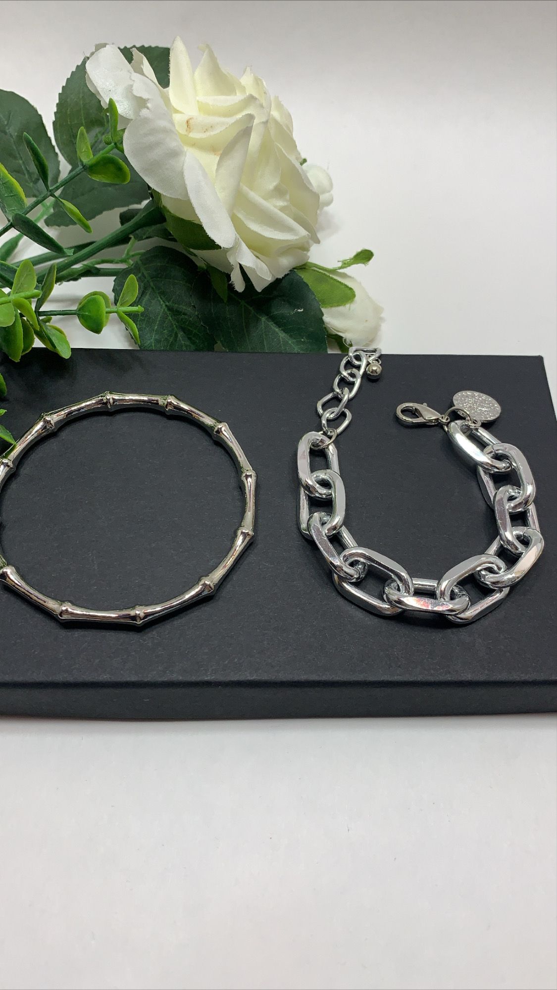 2Pcs Set Gold Plated Bamboo Thick Chain Link Chain Charm Bracelet, Silver Color