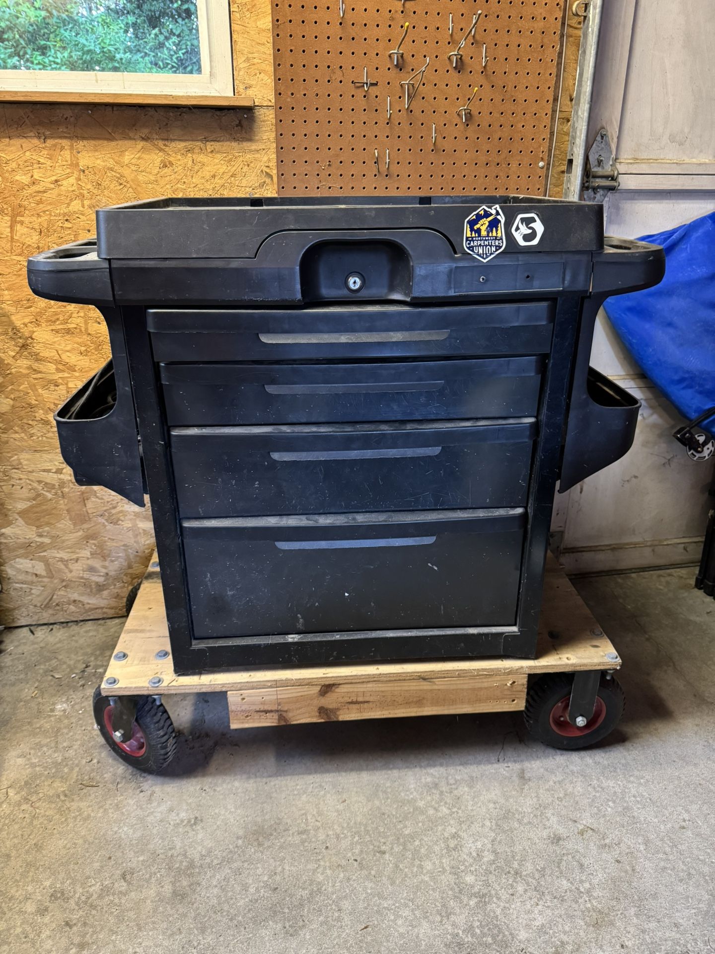 Tool box with drawers, attached power strip for charging or running tools, dividers and organizers. Good for shop or garage use! H 41 1/2” W 38” D 20”