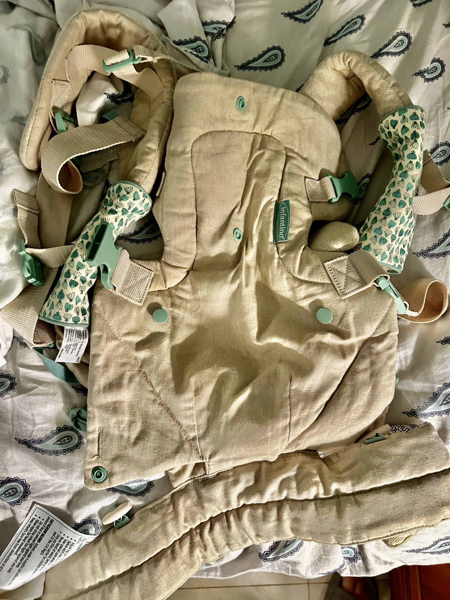 Buckle closure, Size adjustable, Machine washable, Multi-carrying positions, Bib attachment, Lumbar support, Organic material