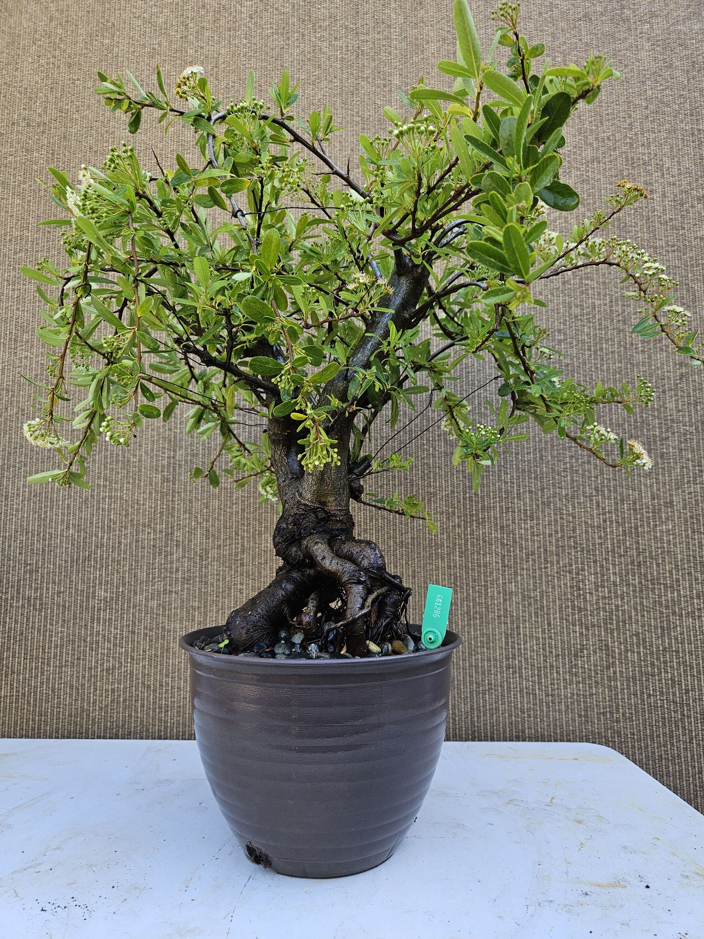 Old Pyracantha Bonsai Tree ___ L20,W20,H24 ( 3.5 inches trunk ) ___ PLASTIC POT ___This picture was taken on Mar 09 , 2026 ___ It is a hardy tree which is easy to care for. ___The tree is growing strong and very healthy now.