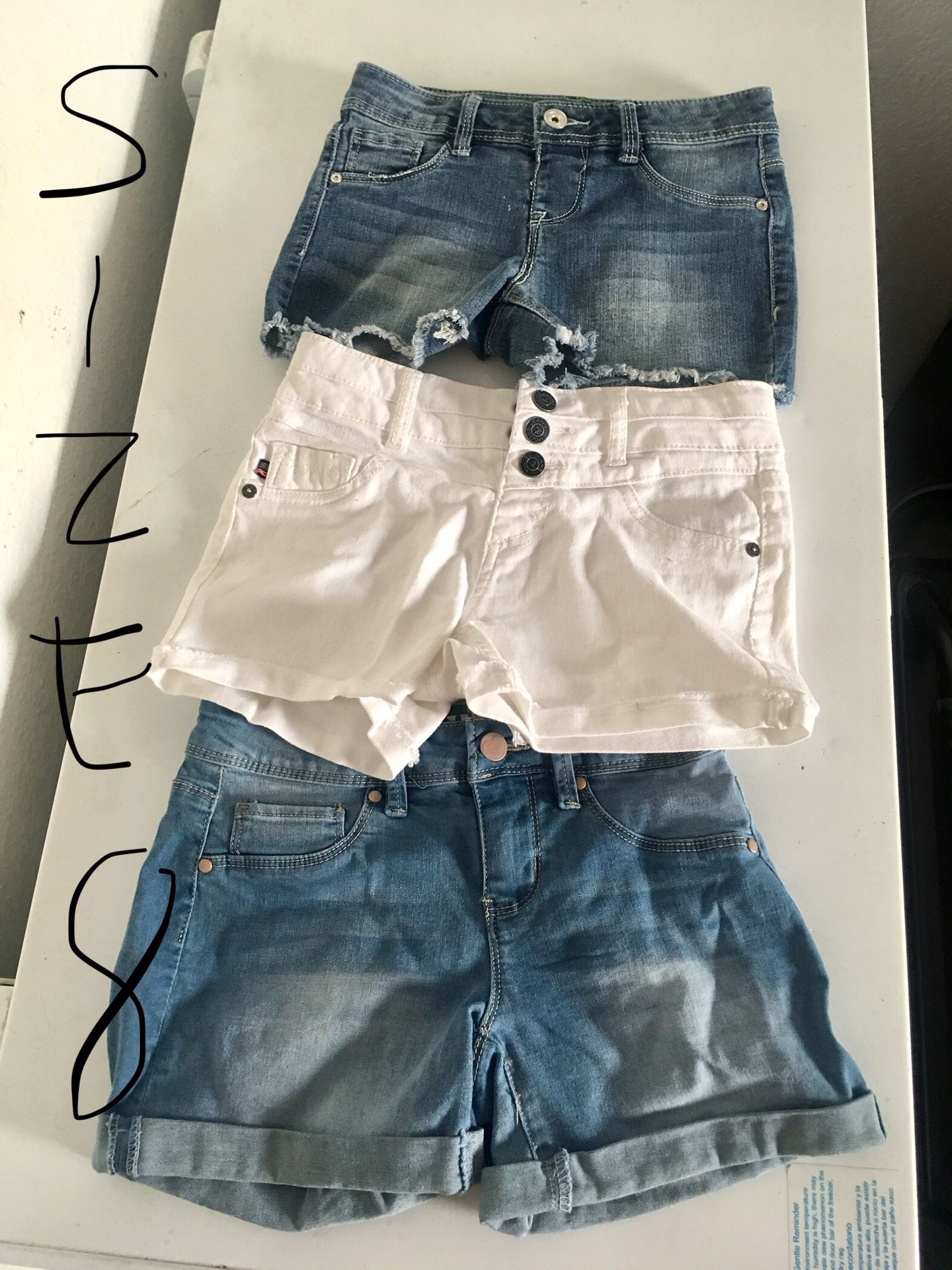 1st Picture three pairs of brand new size 8 girls shorts $5 each Second picture two pairs of used good condition size 8 shorts three dollars each Third picture is two pairs size 7 girl shorts three dollars each