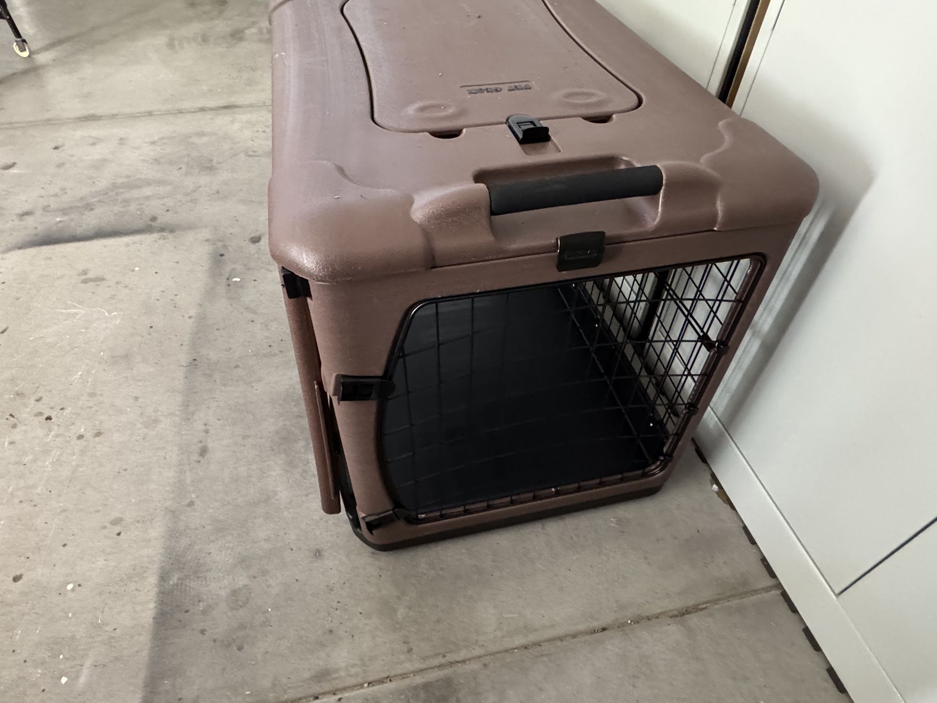 36.5 x 27.5 x 24.5 inches Water-resistant plastic. including a large side door that opens and stays ups like a garage door. Tool-free setup and fold-down. Built-in wheels and handle make moving from room to room a cinch. Includes bolster pad included for doggone good comfort and storage bag for easy transport. Rounded corners mean no sharp edges that could poke him or your home.