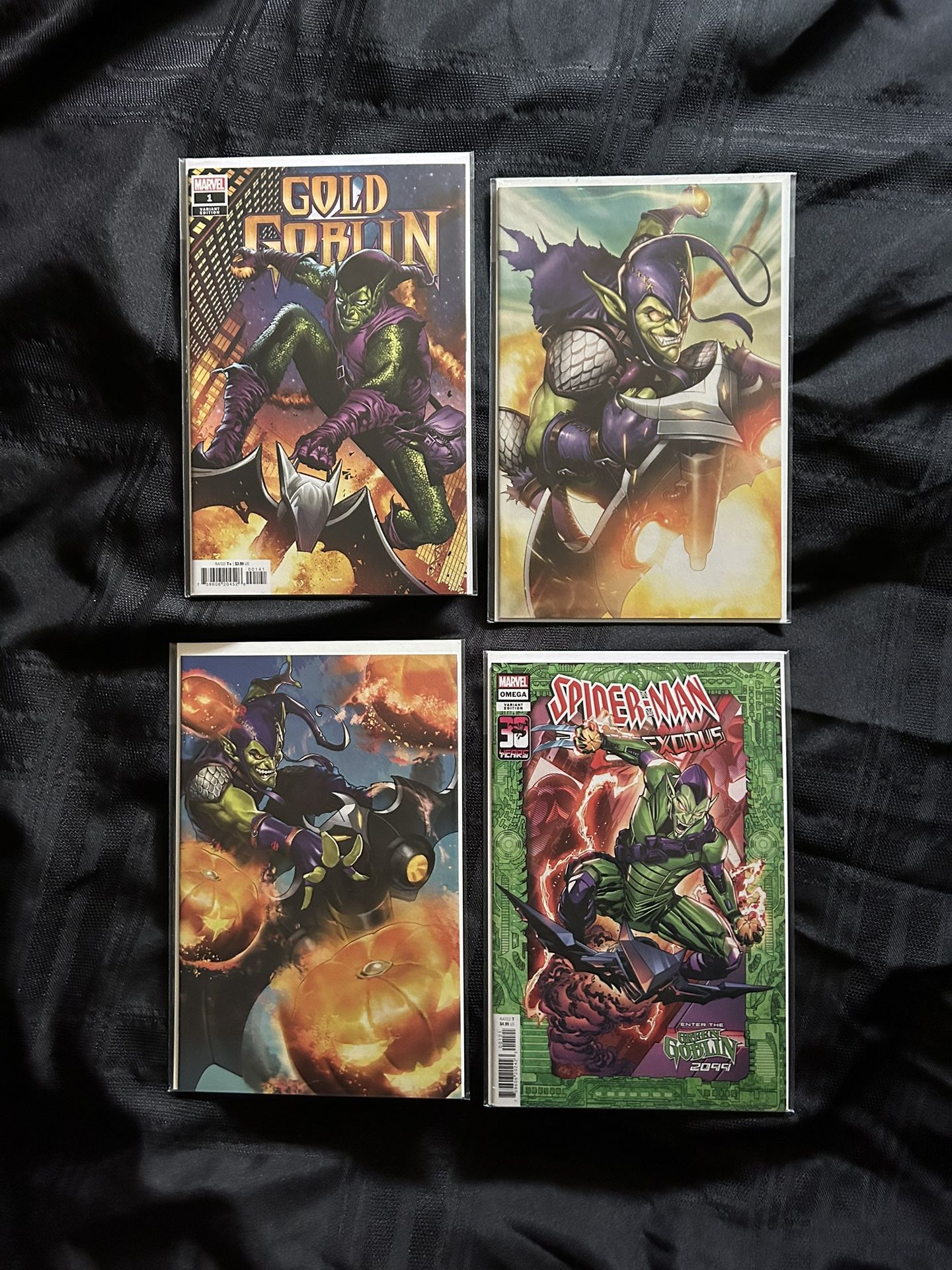 Character lot includes: • Gold Goblin (2022) 1 Marco Checchetto Goblin Variant • Amazing Spider-Man (2018) 8 Yoon Lee Battle Lines Virgin Variant • Spider-Gwen Ghost Spider (2018) 8 Nexon Battle Lines variant • Spider-man 2099 Exodus - Omega (2022) Ken Lashley 2099 Frame Variant