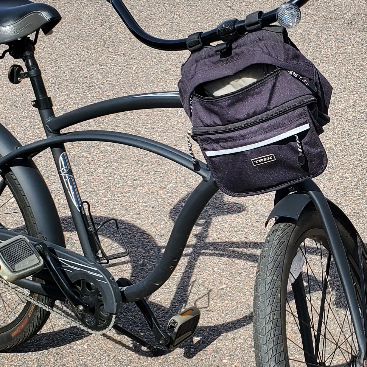 Sturdy, comfortable bike. No gears, a beach cruiser. Includes Trek handlebar bag. 26", black. Cash or Zelle