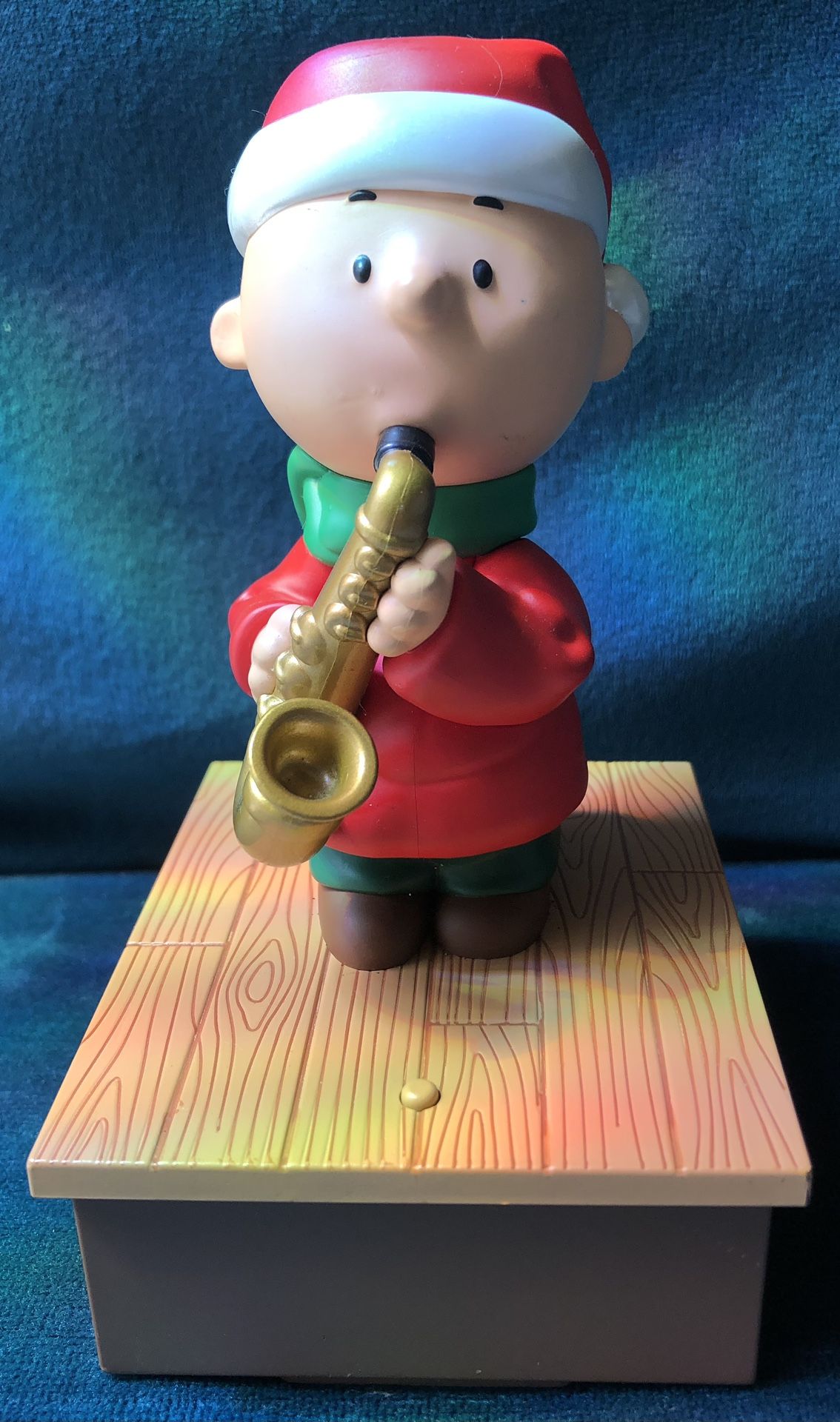 The 2011 Hallmark Wireless Peanuts Band Charlie Brown is battery-operated animated figure that plays the saxophone -specifically performing "The Twelve Days of Christmas" and "It Came Upon a Midnight Clear". -Part of a five-piece wireless set -5¼-inch tall figure operates with 3 AAA batteries -features interactive, synchronized music up to 50 feet apart, and includes a 90-second interval timer. Release Year: 2011 Dimensions: Approximately 3¼" w. x 5¼" h. Power: 3 AAA batteries (not included) Material: Plastic Songs Played: "The Twelve Days of Christmas" and "It Came Upon a Midnight Clear" Functionality: -Moves and plays music -Will also sync with other 2011 Peanuts Wireless Band members (Snoopy, Lucy, Schroeder) Wireless Range: Up to 50 feet apart Timer Mode: Plays every 90 seconds Band Members: Charlie Brown (Saxophone) Snoopy (Guitar) Schroeder (Piano) Lucy (Flute) Linus (Trumpet) -When the band is placed together, they play harmonized music.