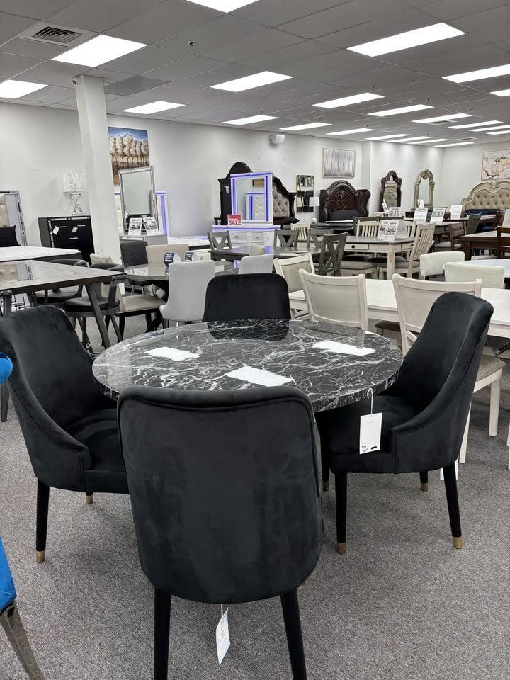 Features: Contemporary Design Rich black Marble look Round dining table Lavish design pedestal accommodate upto 6 guests Dining Chairs features gold accent Dining chairs are available in black, grey and cream color Dining Table Dimensions: L" 48 W" 48 H" 30 Dining Table @ $599.00 5 Pc Dining Set @ $999.00 (Includes Dining Table + 4 Dining Chairs) We offer various finance plans $39 down same as cash with no interest for 90 & 100 days. Longer financing plans are also available. Lowest prices, great quality products and exceptional service guaranteed. We also have a wide range of other living room, bedroom and dining room products to choose from at highly affordable prices. For buying visit Splendid Furnishings located at 4073 Lavista Road, Suite 311, Tucker GA 30084 or call 470-269-9301.