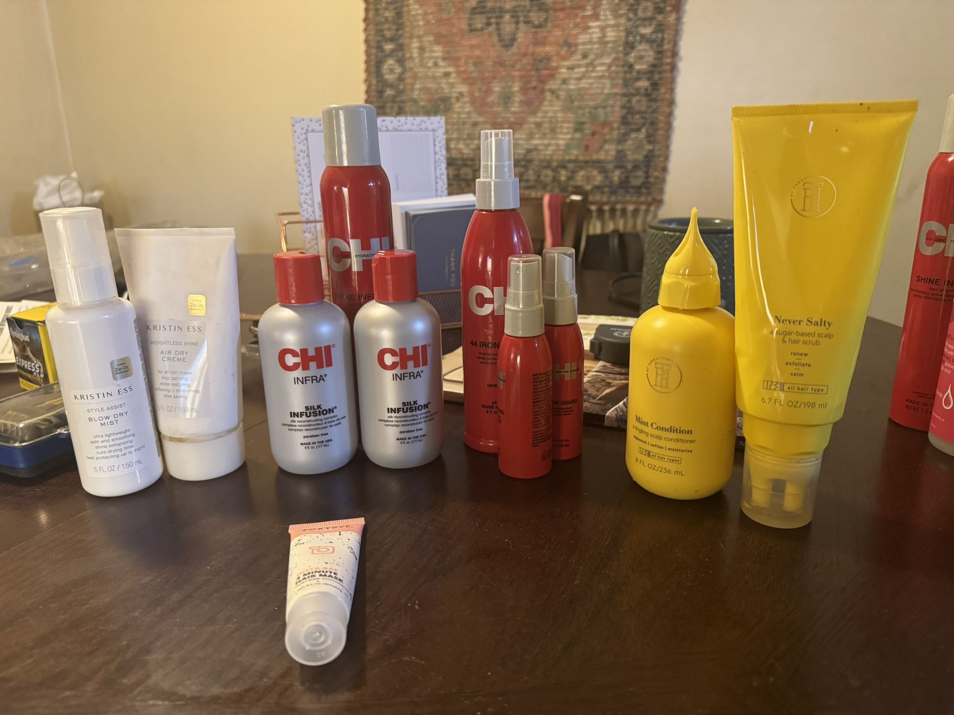 Brand new, never opened or used hair products. High-quality salon and popular beauty brands. Perfect for someone wanting to stock up or build a full hair routine. Includes: • CHI Silk Infusion (2 full-size bottles) • CHI Shine Infusion spray • CHI Iron Guard (full size + 2 travel sizes) • Kristin Ess Blow Dry Mist • Kristin Ess Air Dry Crème • TPH Mint Condition scalp conditioner • TPH Never Salty scalp & hair scrub • FoxyBae Insta-Bae hair mask Everything pictured is included. $75 for the full bundle. Pickup in Winston-Salem. Cash, Venmo, or CashApp accepted.