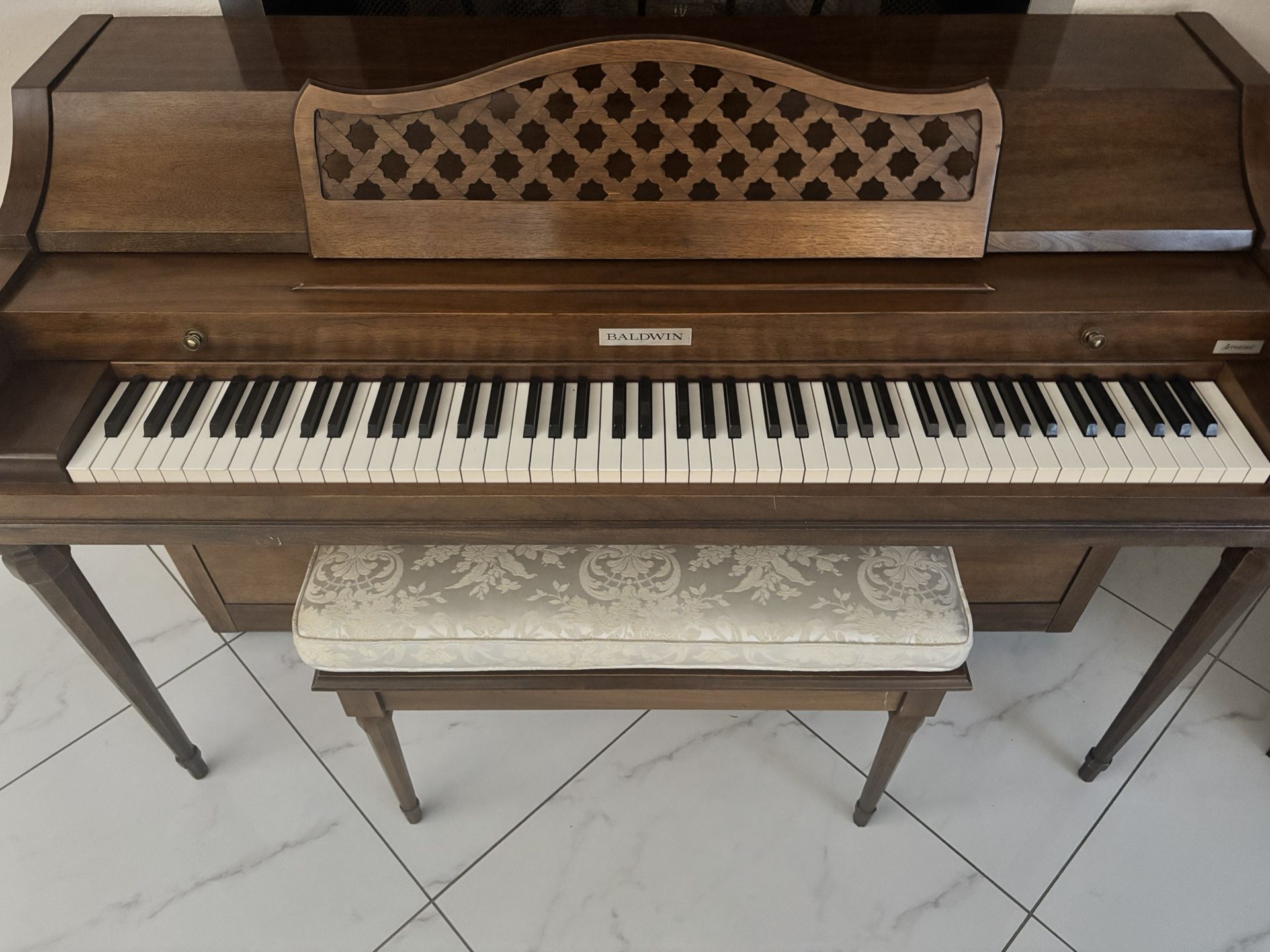 Baldwin Acrosonic upright piano Made in the USA Made circa 1970 PROFESSIONAL DELIVERY INCLUDED* Key Characteristics: Rich Tone: Despite their smaller size (spinets and consoles), they deliver a full, powerful sound, unusual for compact pianos. Responsive Touch: They use a direct action, avoiding the "mushy" feel of drop actions found in many spinets, providing better control. Quality Construction: Features solid spruce soundboards, hard rock maple bridges, and precision parts. *Professional delivery included only in Tucson city limits and to a location on the ground level.