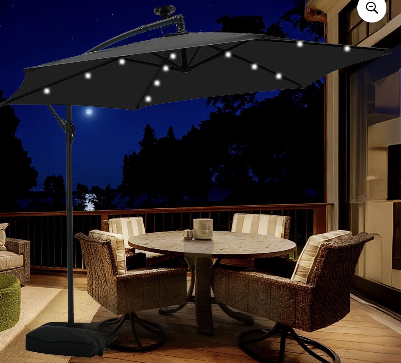 NEW in Unopend box 10FT Cantilever Patio Umbrella w/ Solar LED Lights & Base – Black