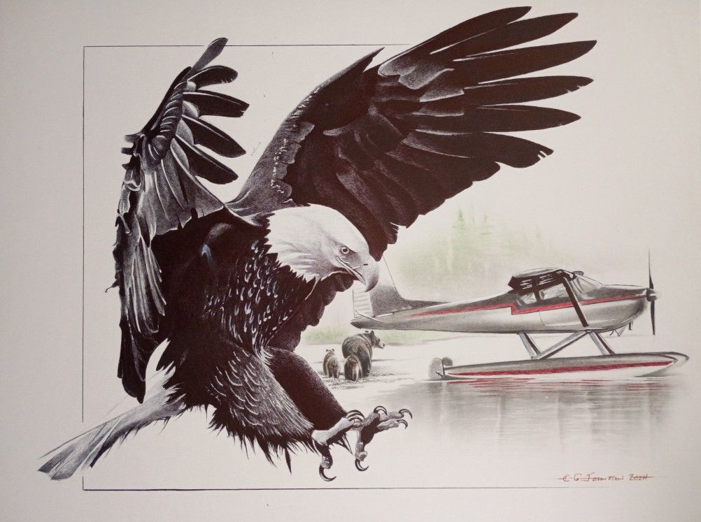 This a 14 x 17 original hand drawn image of an Alaskan bald eagle overflying a bush float plane with a mother grizzly and her three cubs.