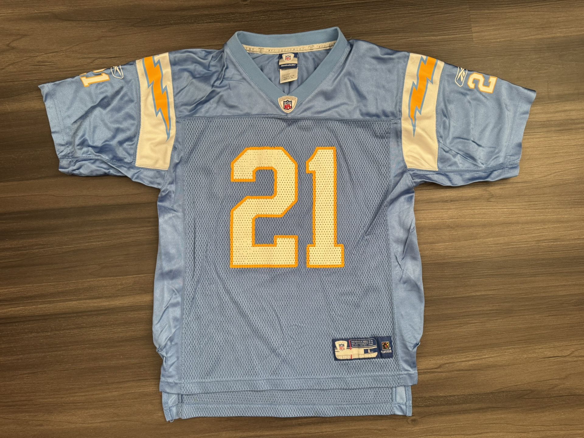 Reebok San Diego Chargers LaDainian Tomlinson #21 NFL Home Jersey YOUTH L 14/16 100% authentic. Good condition. This product is a Vintage Reebok San Diego Chargers LaDainian Tomlinson #21 NFL home jersey in size youth L (14/16). It is an officially licensed jersey for young fans of the National Football League (NFL), specifically featuring the player LaDainian Tomlinson from the San Diego Chargers. The jersey is in the team's blue color and is suitable for both boys and girls who are fans of football. Made in the Russian Federation, this jersey is perfect for showing support during the regular season games.
