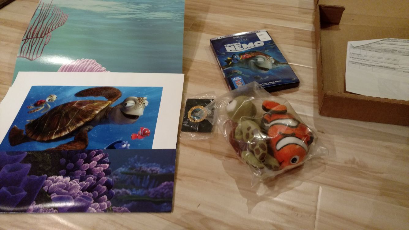 Nemo collection by Walt Disney comes with Finding Nemo DVD Nemo and Crush little stuffed animals Nemo collector pin and several posters please see pictures. New in open box but never used everything is still sealed