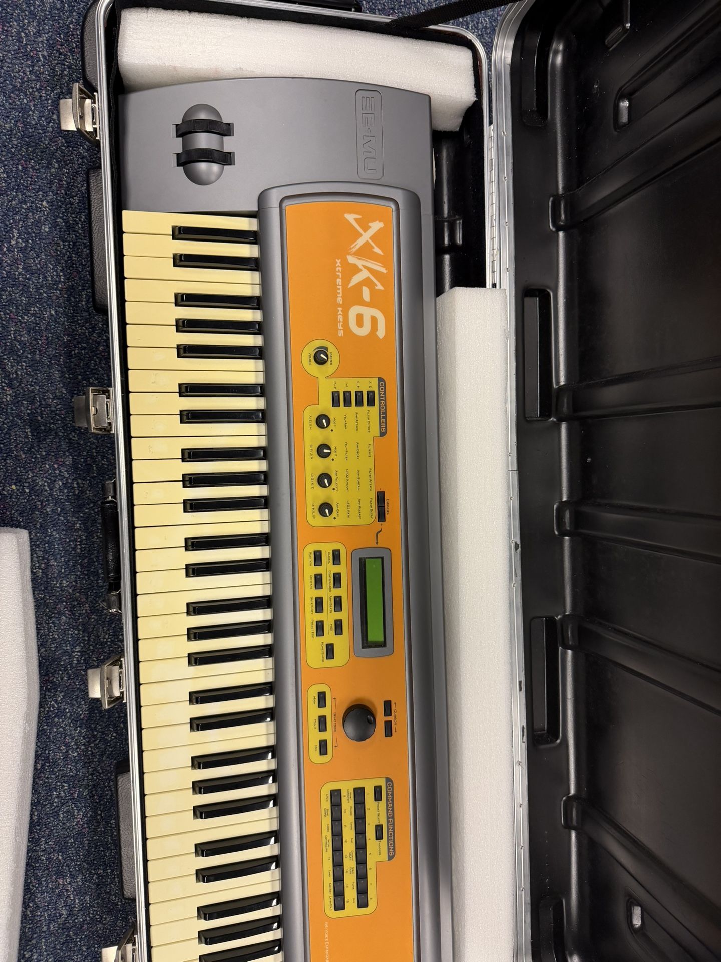 Vintage E-MU XK-6 61-key synthesizer has orange control panel with 16 real-time controllers. Unit comes with heavy duty SKB hard shell flight case for protection. Keyboard is gray with yellowed keys from age. It has MIDI and audio outputs on back.