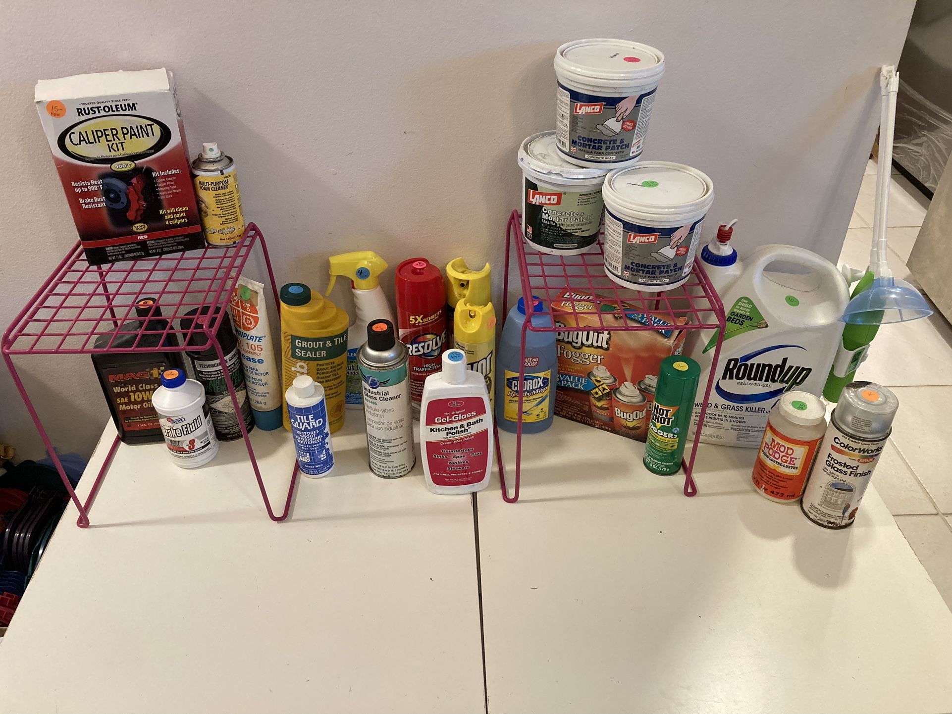 Some New / Some Used Weed & grass killer, bug foggers, Clorox ready mop refill, frosted glass finish spray, Sealer glue & finish, kitchen & bath polish, glass cleaner, furniture polish, carpet cleaner, grout cleaner, grout & tile sealer, motor, grease, brake fluid, air, intake, system, cleaner, 10W-30 motor oil, multipurpose foam cleaner, caliper clean & paint kit