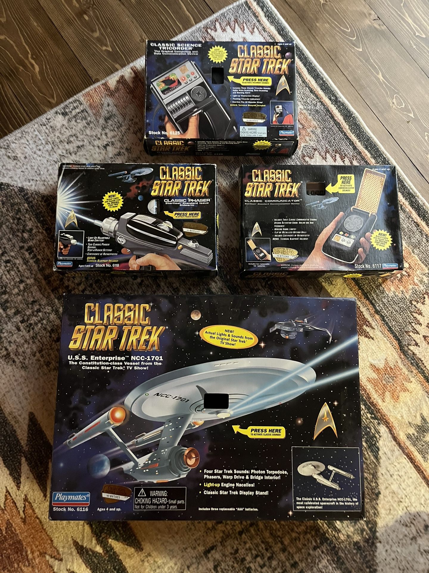 Set of 4 Star Trek Collector Series collectibles… USS Enterprise has been opened / built & in perfect condition. Other 3 smaller items — classic science tricorder / classic communicator / classic phaser — are new in box. FREE Star Trek Compendium book w/ purchase. The perfect Trekky gift!