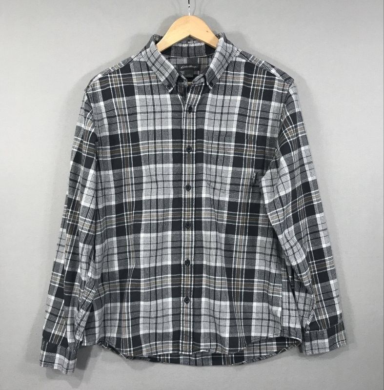 Eddie Bauer Shirt Men's Large Gray Black Plaid Flannel Long Sleeve Button-Down