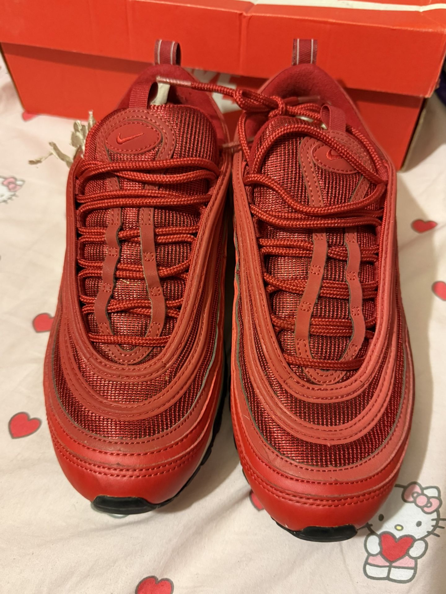 Dynamic red Nike Air Max 97 with signature wavy design. Ideal for everyday style.