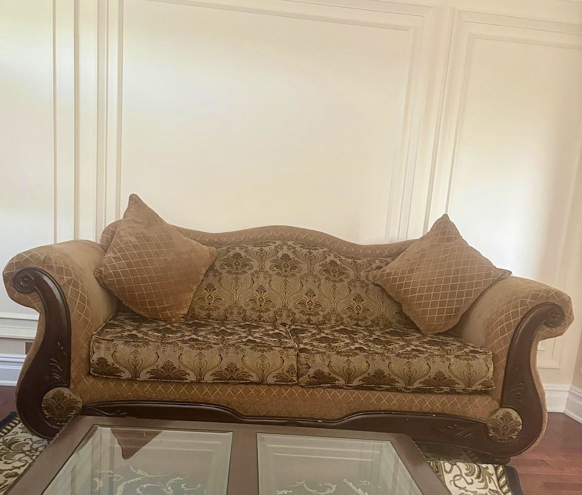 Elegant sofa set with chaise with gold damask detailing. Like new.