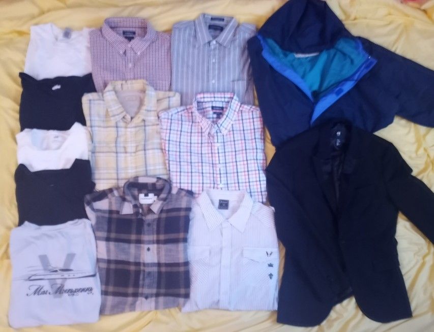 Button up short sleeve shirts, long sleeve ts, short sleeve ts, windbreaker. Sports jacket. Some shirts are over $100 retail. Need gone today. XL