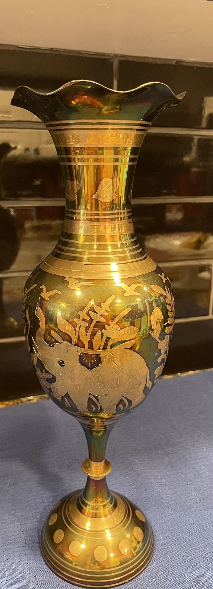 Beautiful vintage brass vase made in India. Handmade brass iridescent finish with black and green color and etched florals with elephant motif and ruffled edges. Stunning design! Pedestal base. Small Dent on base. Stamped on bottom. 12”T X 4.25” W