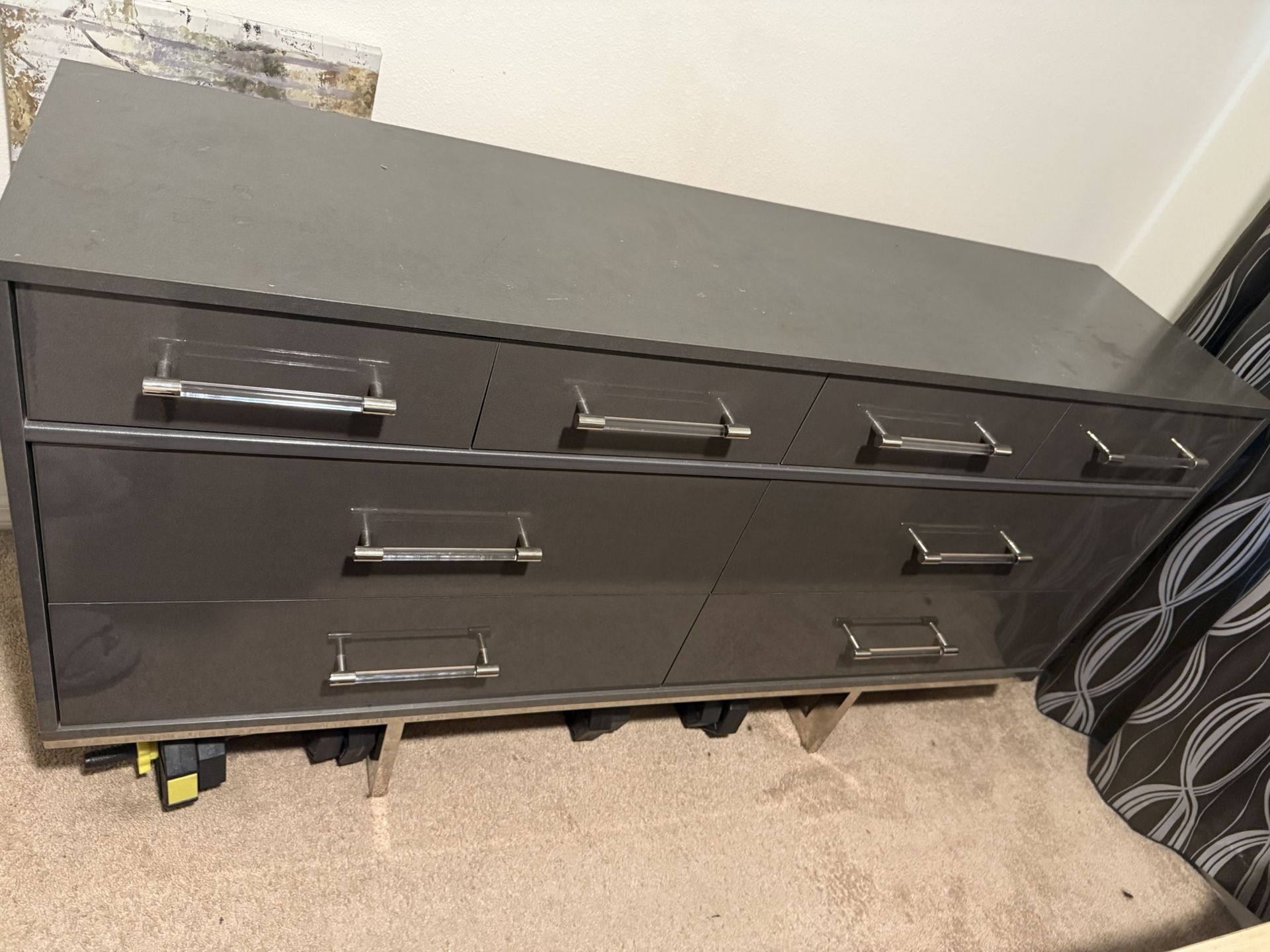 Used - like new. Dark gray with heavy sterling silver legs. Very spacious . Bought brand new 3 years ago. The movers cracked a a tiny area of the ply wood in the back . Easy fix . Need gone today !! You Will have to bring your own people, equipment and truck to move dresser. Price is final . Moving in 3 weeks!