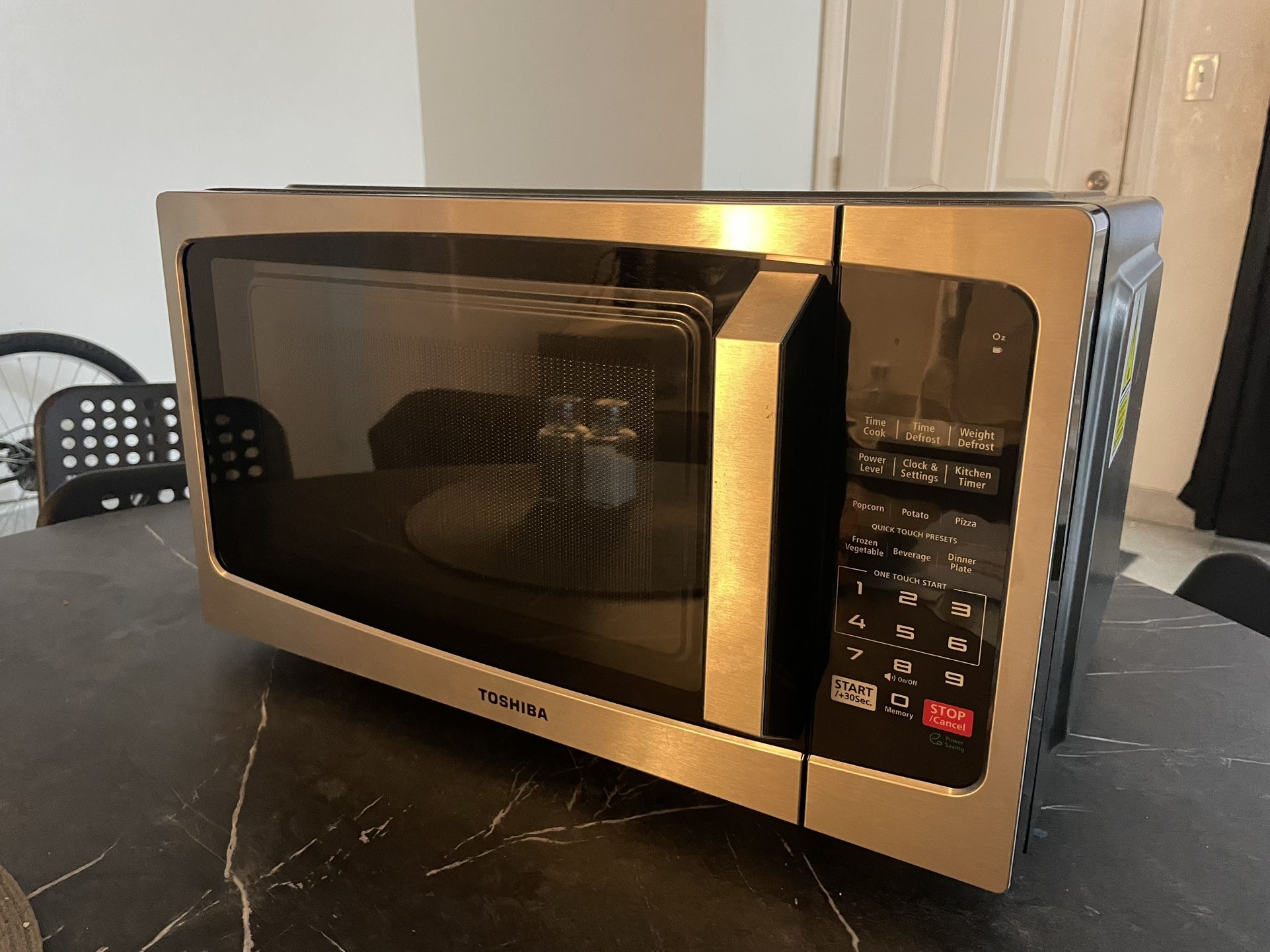 Microwave, used but like new. 18 inches long, 9.5 inches tall, 12 inches wide. From Toshiba.