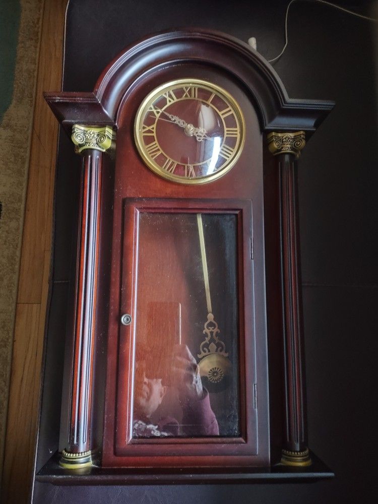 Vintage Herman Miller Style Bombay Company Chime Pendulum Clock. Rich cherry wood finish. Glass Cabinet, Roman numerals, gold trim, Measures approx 24”x12”x4” Beautiful clock in fantastic condition looks new!