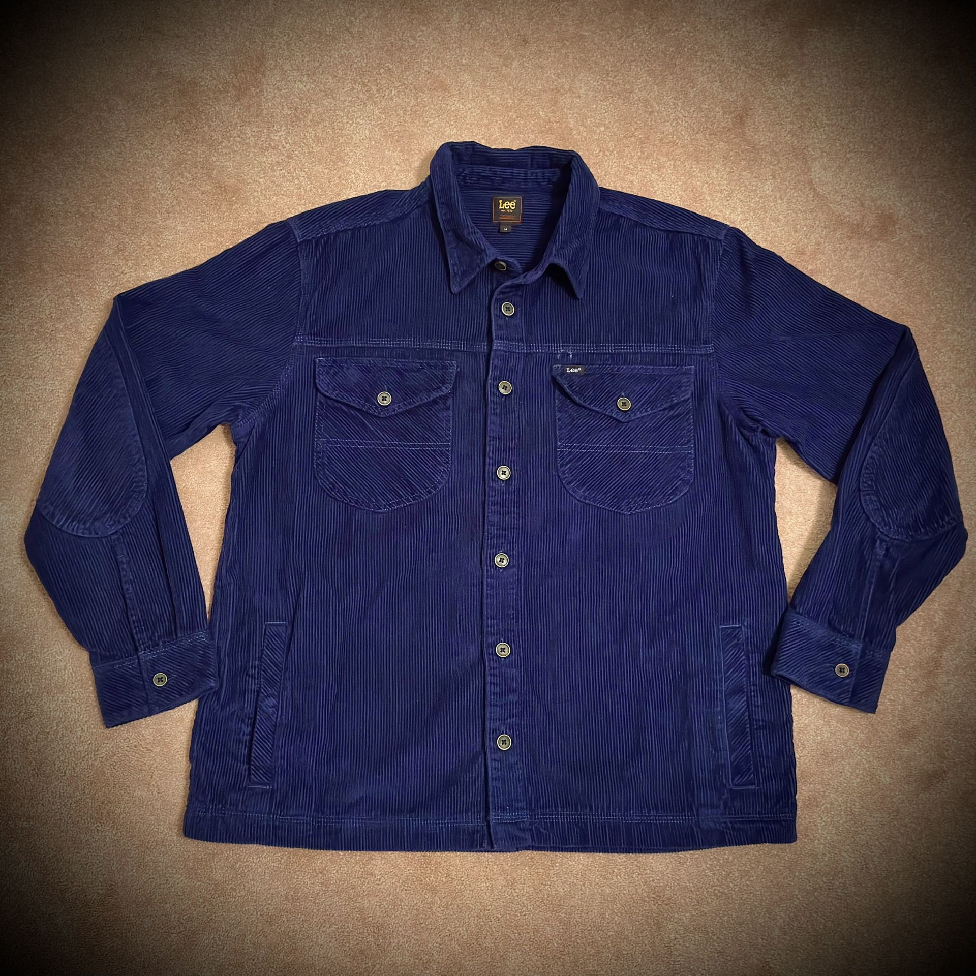 Here is a men's size Medium, dark blue, premium heavy-gauge corduroy over-shirt designed by Lee. Constructed offering superior durability and a comfortable, relaxed fit, this over-shirt perfectly blends Lee's authentic workwear heritage with modern wearability. Key design elements include button securing chest pockets, a pair of side seem snap securing pockets, stylish elbow patches, and reinforced button cuffs, all adding to its rugged charm. Made from 100% pure cotton, it ensures breathability and comfort for all-day wear, whether layered or worn solo. Originating from a meticulously kept, pet-free and smoke-free home, this over-shirt is in excellent condition. Please consult the attached photos for detailed dimensions.