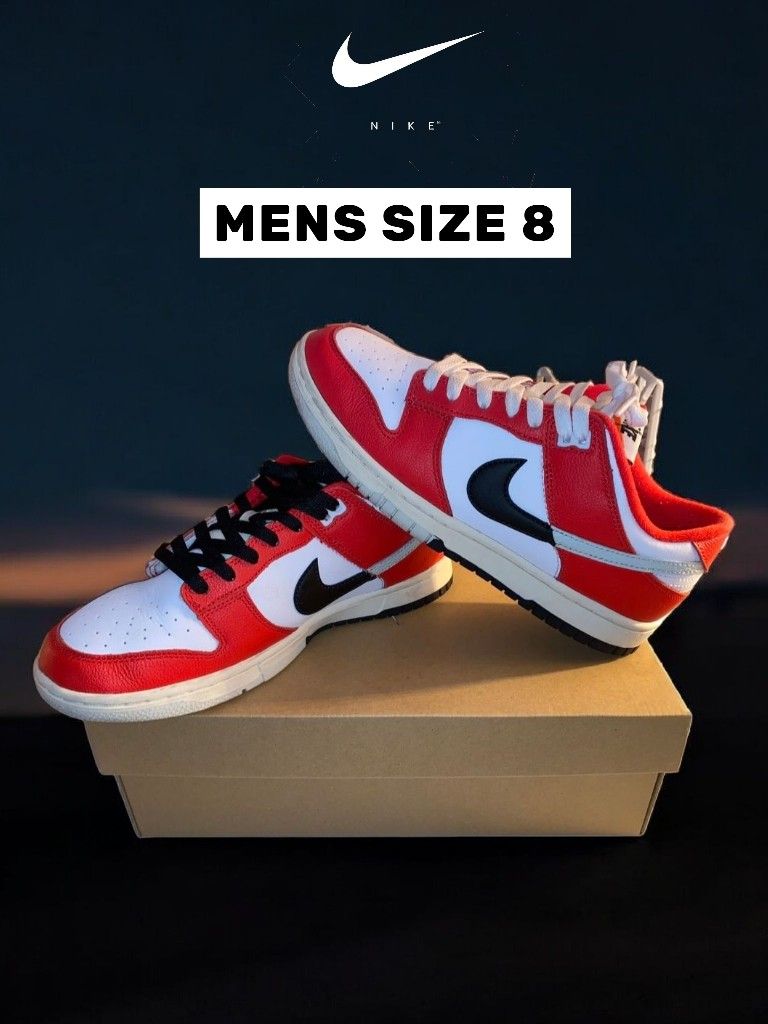 USED WORE only 4x selling some of my Shoe collections i dont wear Excellent condition Size - Mens 8 Sneaker Dets In a color scheme synonymous with MJ, the Nike Dunk Low in 'Chicago Split' presents a clean white foundation on the leather upper complemented by contrasting University Red overlays. The side panel is intersected by a split leather Swoosh in a combination of Light Silver and black. To enhance the vintage aesthetic, the midsole features an off-white finish, reinforced by a two-tone rubber outsole for reliable traction. Nike branding hits on the tongue tag and back tab echo this split-design motif, paying tribute to Nike's rich heritage while embracing the present. Red black white cream nike dunks low sneakers shoes