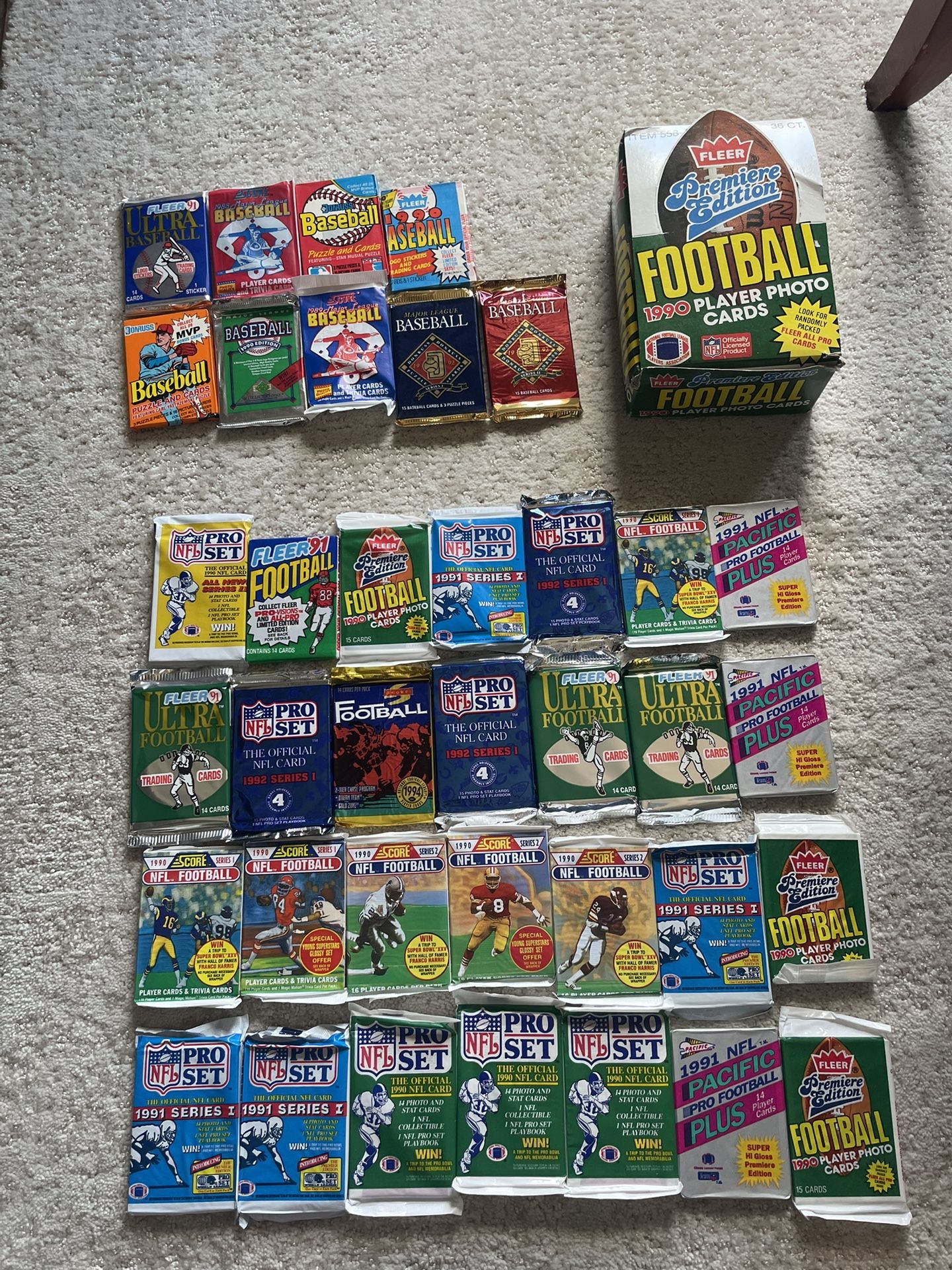Unopened football and baseball packs with a 1990 Fleer football booster box of 36 count unopened packs!