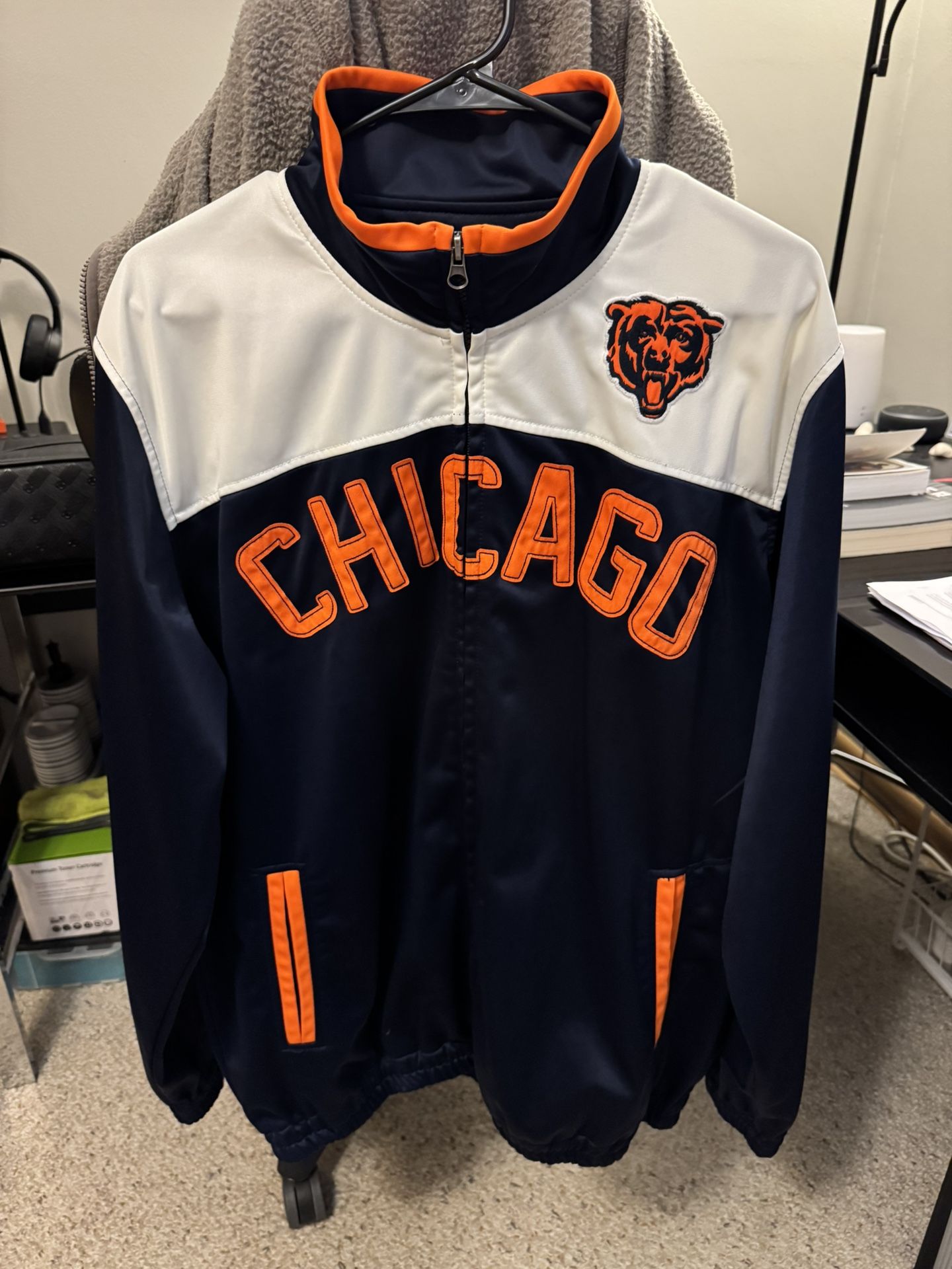Have a very gently worn Chicago Bears vintage zip up sweater. Size men’s large. This is official NFL merchandise not a knock off. Real stitching not heat pressed lettering/logos. End of sleeves and waist are elastic. Will trade for other bears merch or a jersey