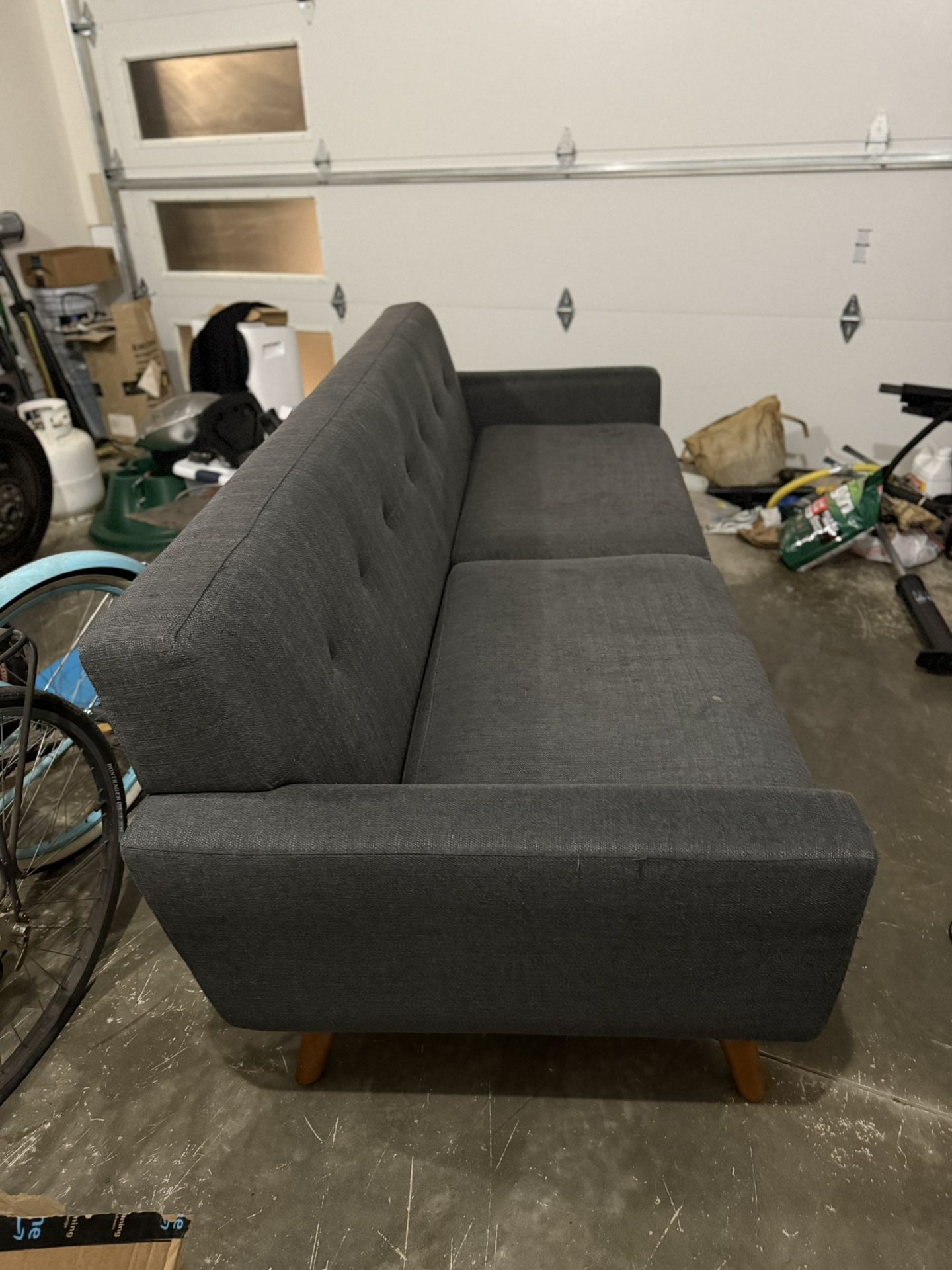 Used 1 stain u can see in photo Some wear u can see in photos Very beautiful sofa There are holes on the bottom part of the pillows where the Velcro attaches but no one can see it unless your looking under the sofa pillows Make me an offer