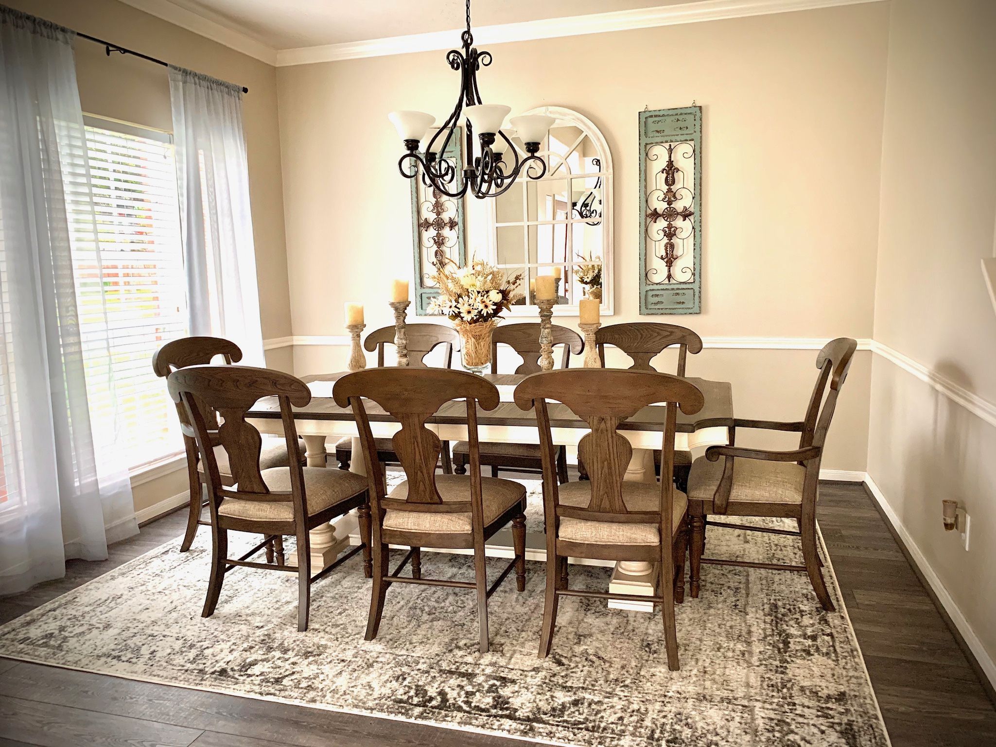 Like new. Never used, just sat in our formal dining room. Minor damage on the legs due to puppy chewing. See Photos. What’s included: 6 chairs, 2 arm chairs Table - Dimensions 7’ x 3’6” without leaves 2 leaves - 18” each Pick up only.