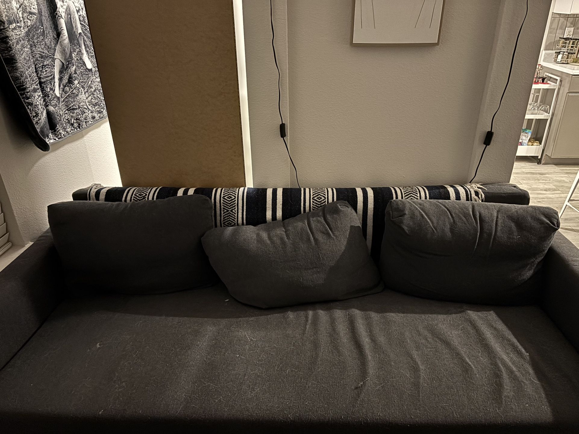 Gray Pull Out Couch With Underneath Storage. Great condition and super comfortable. One snag on one of the corners that I sewed from moving, and a small paint stain on the couch itself. I always had a couch blanket over it.